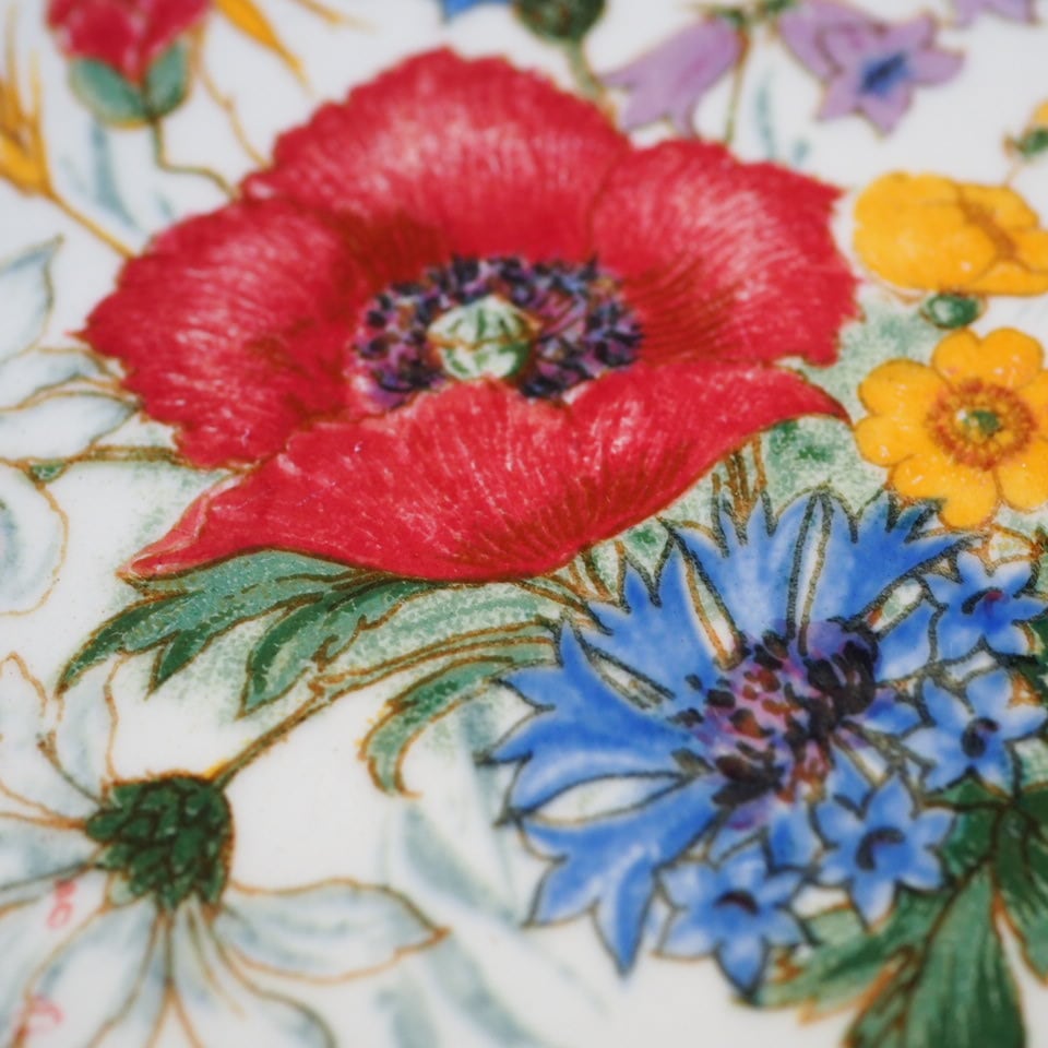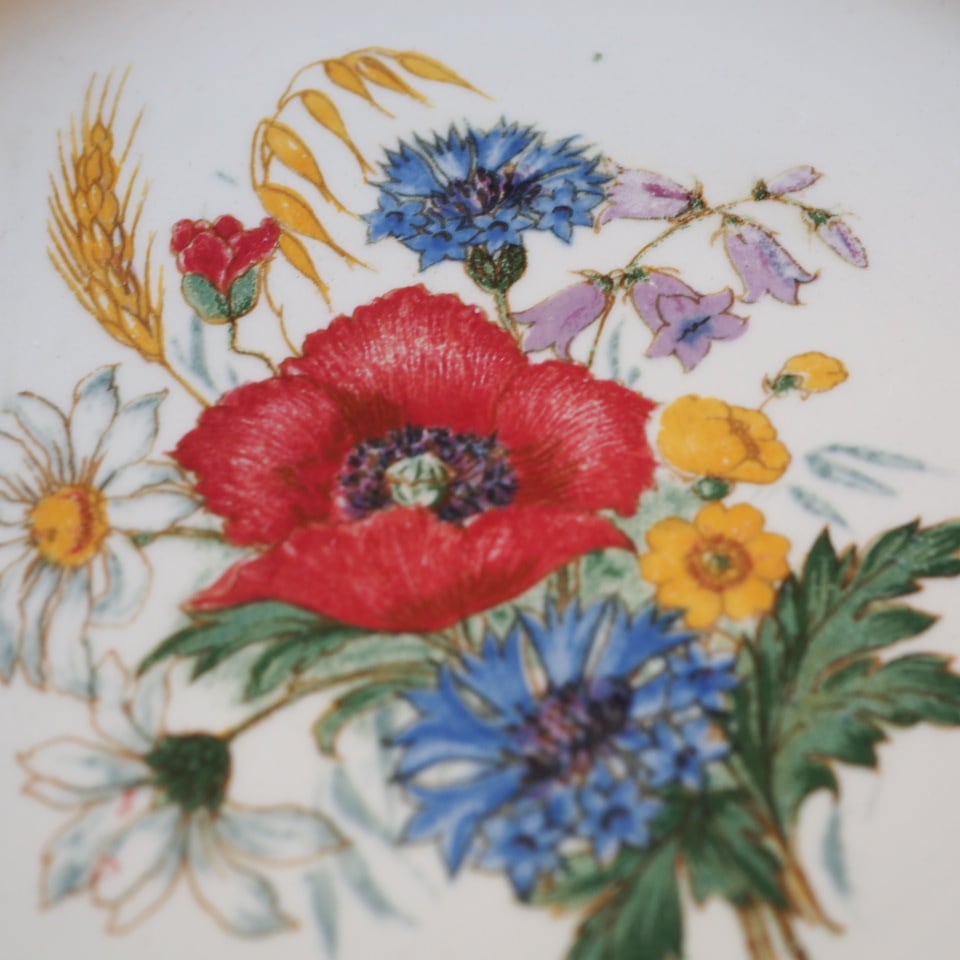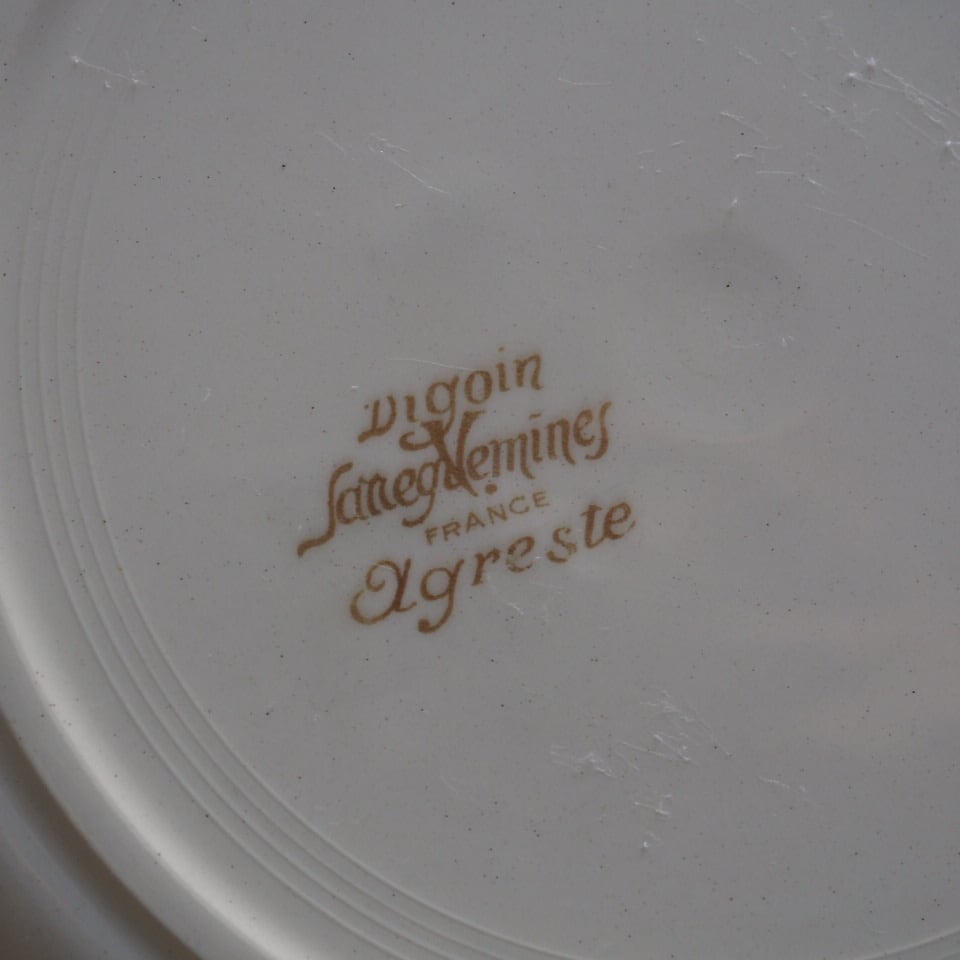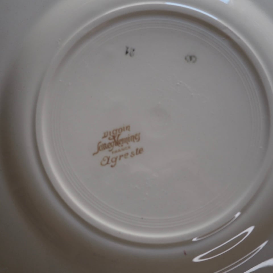ひなげしや矢車菊など、麦畑に咲く野の花が配されたディゴワン・サルグミンヌのシリーズ「アグレスト」のプレートです。数十年間続いた人気シリーズ。ボルドー色で縁取られ、可憐でかつ落ち着いた印象です。