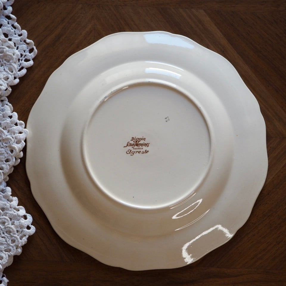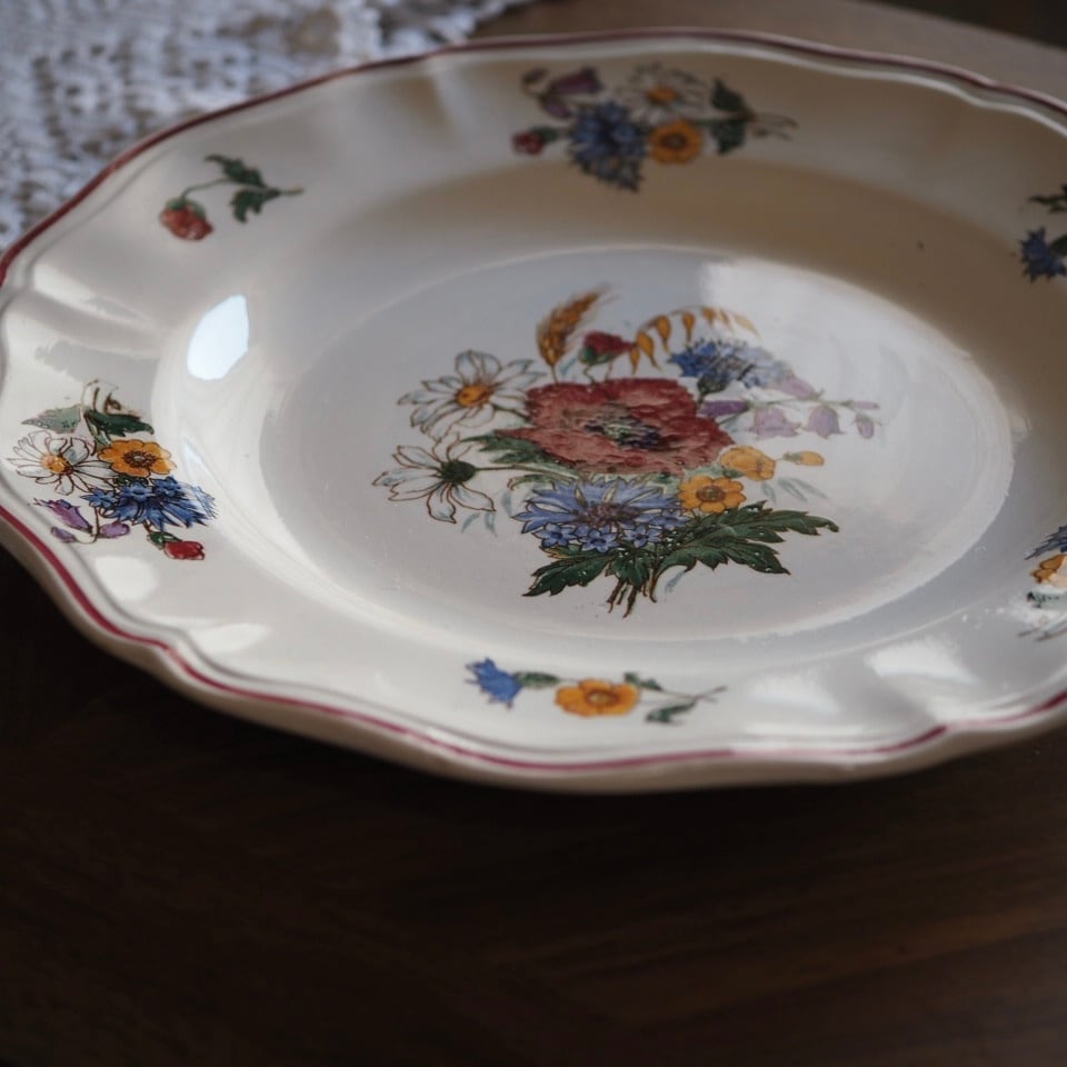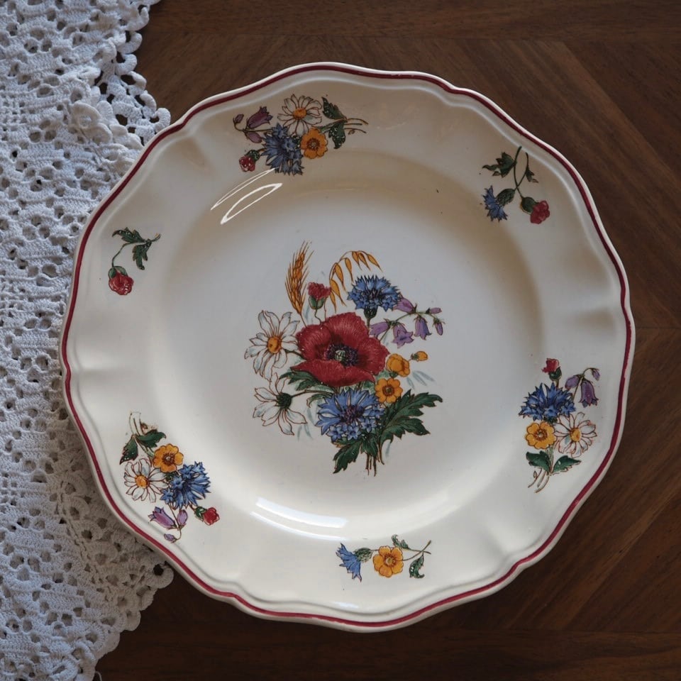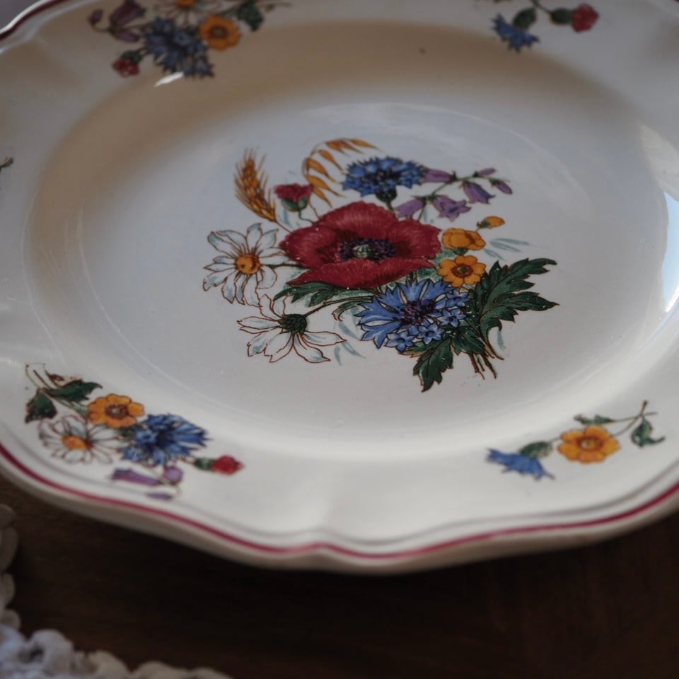 ひなげしや矢車菊など、麦畑に咲く野の花が配されたディゴワン・サルグミンヌのシリーズ「アグレスト」のプレートです。数十年間続いた人気シリーズ。ボルドー色で縁取られ、可憐でかつ落ち着いた印象です。