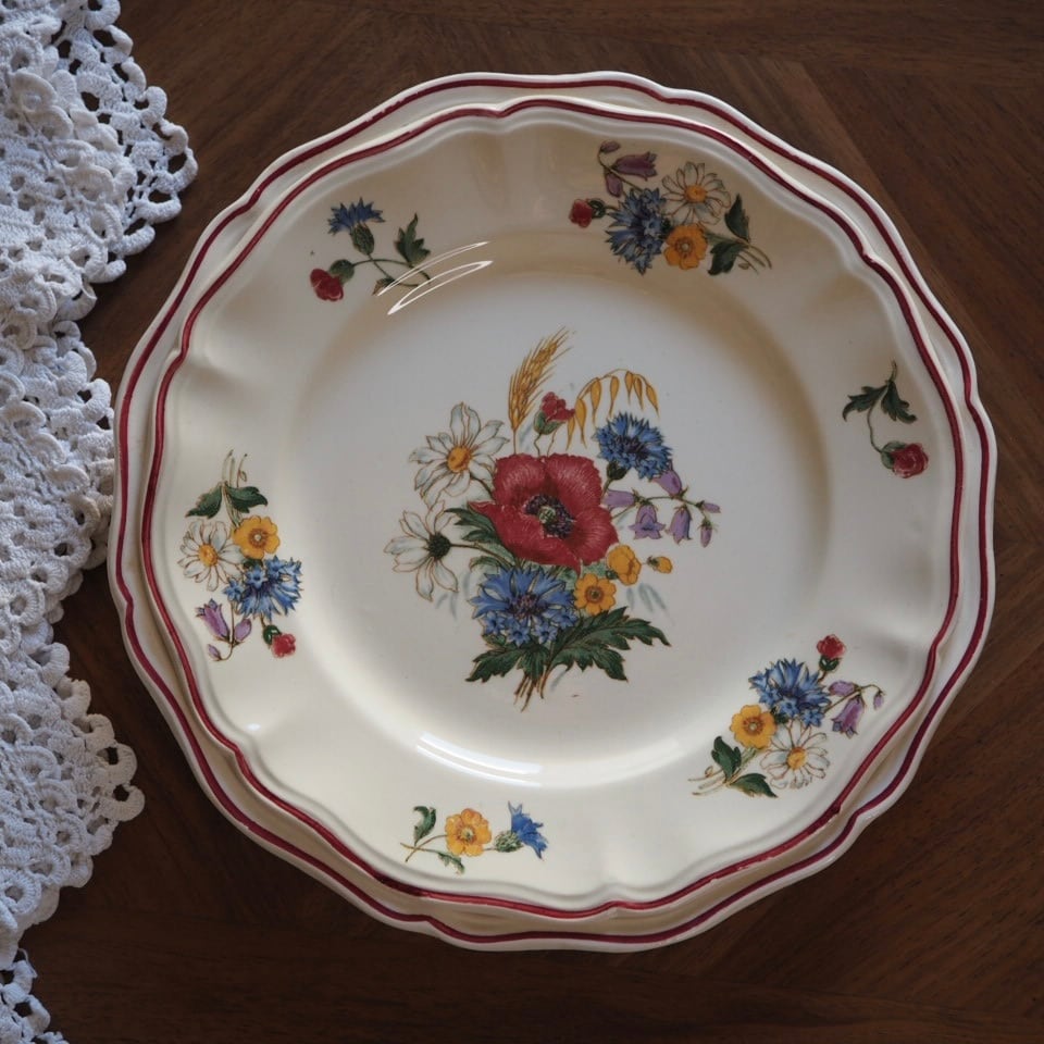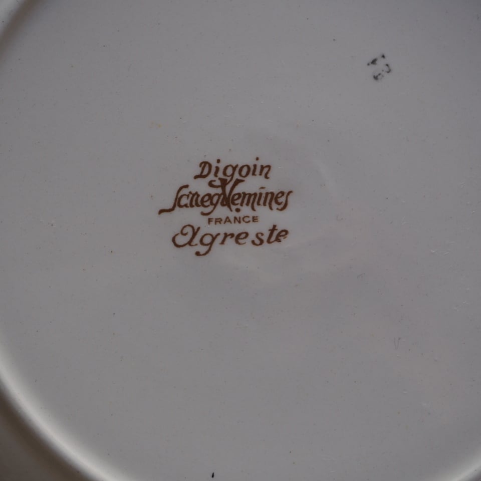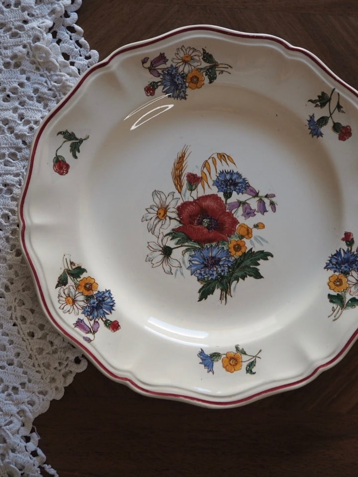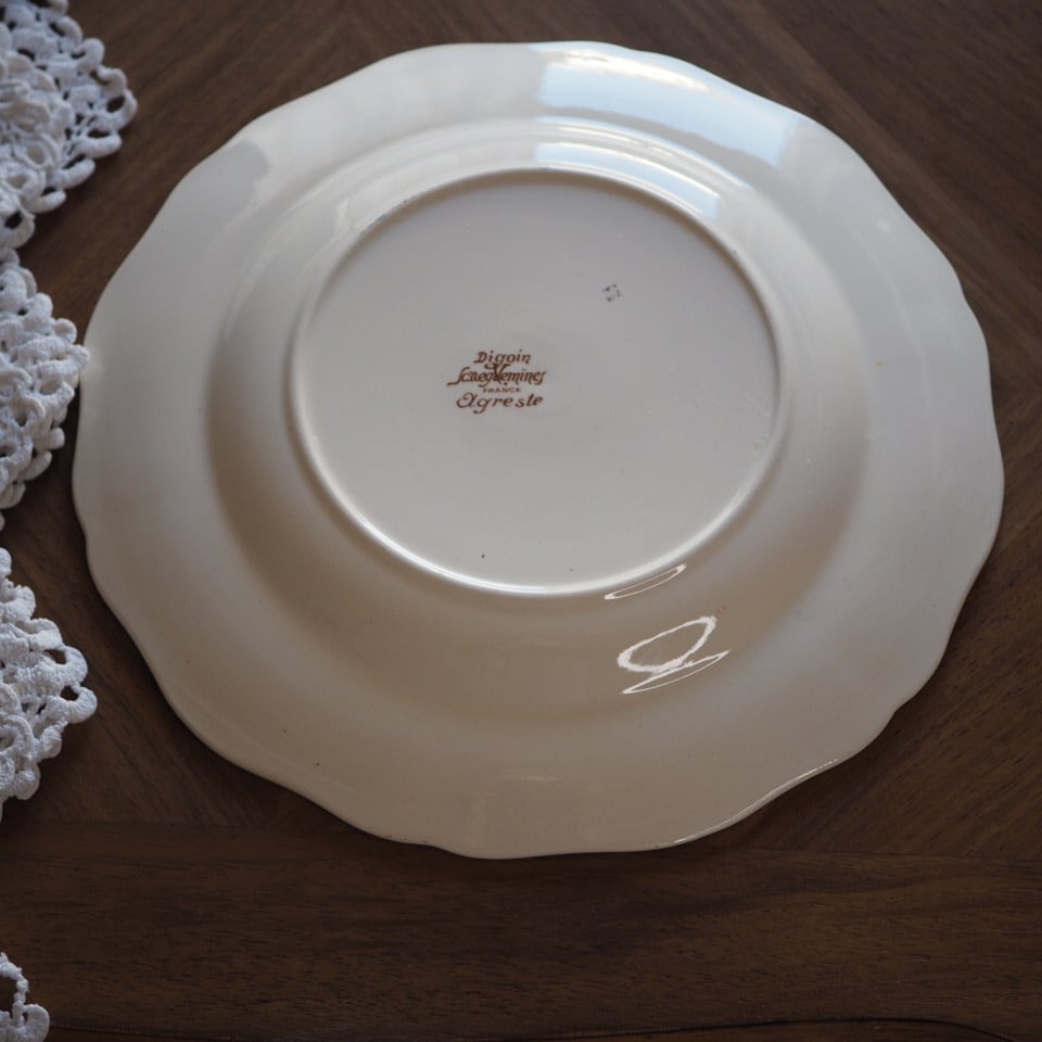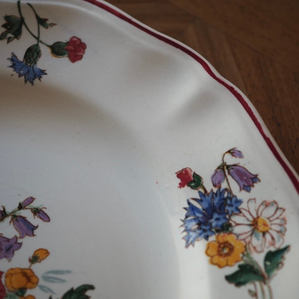 ひなげしや矢車菊など、麦畑に咲く野の花が配されたディゴワン・サルグミンヌのシリーズ「アグレスト」のプレートです。数十年間続いた人気シリーズ。ボルドー色で縁取られ、可憐でかつ落ち着いた印象です。