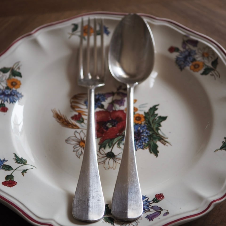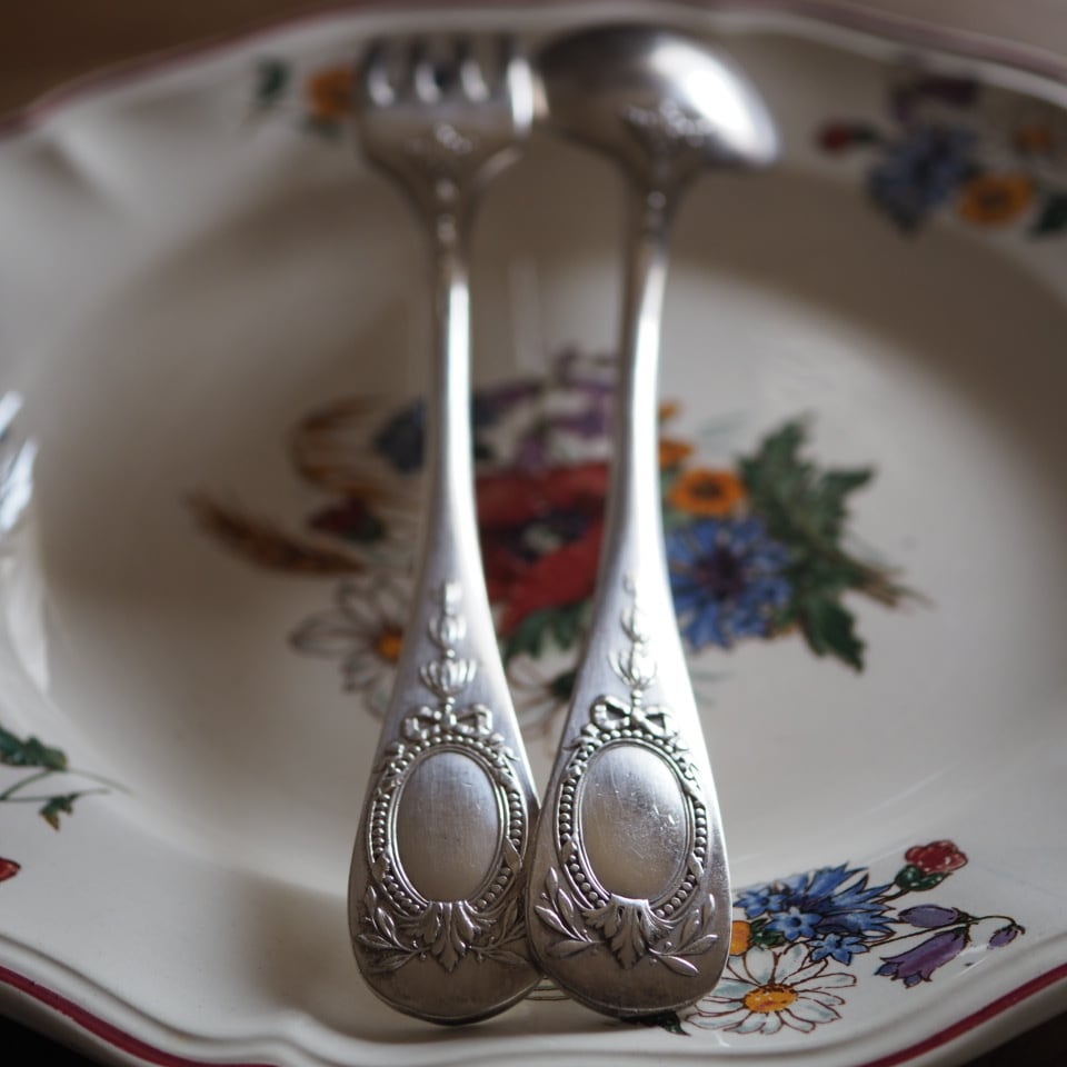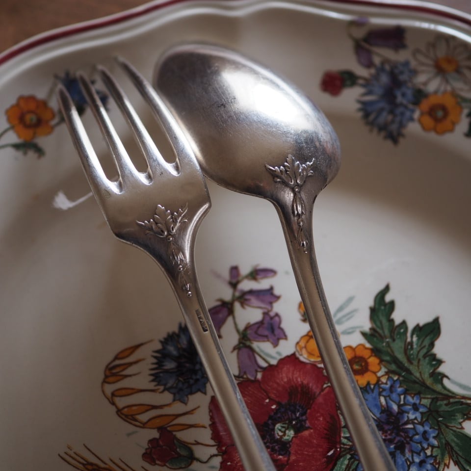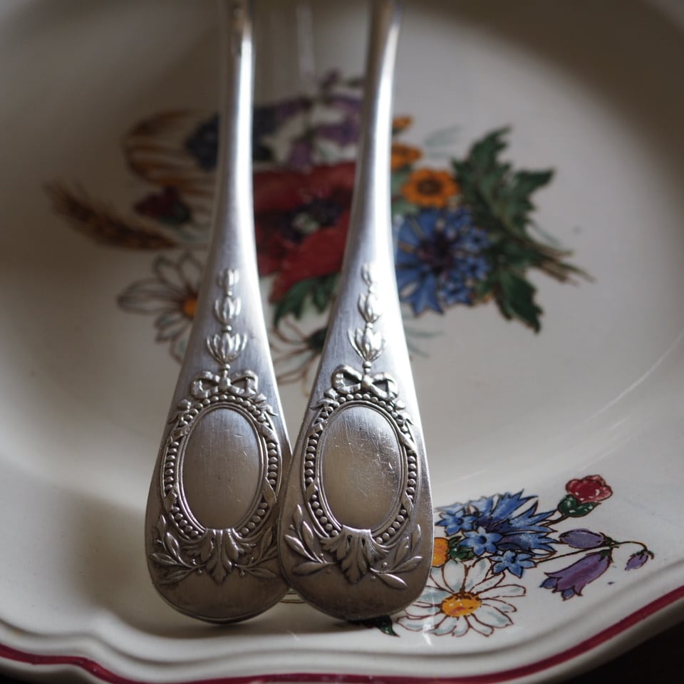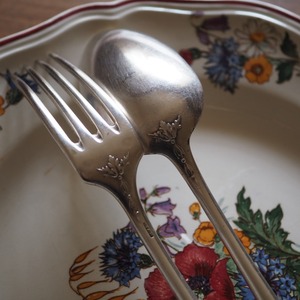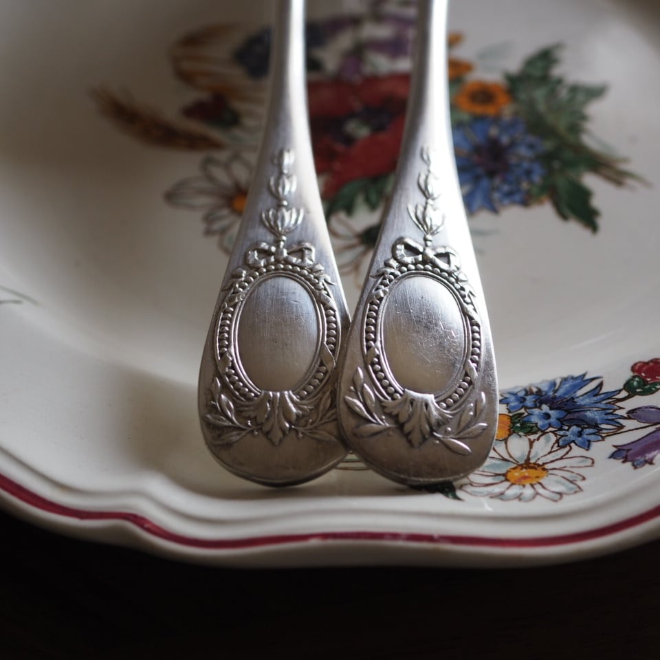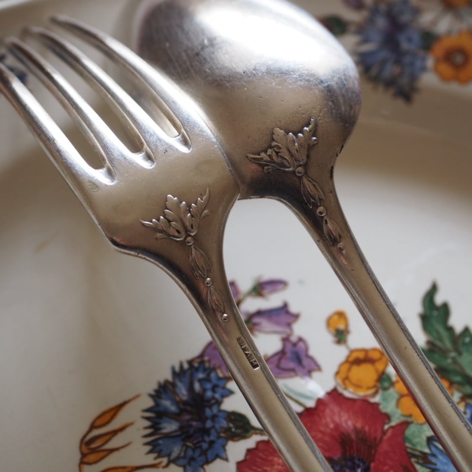 シルバープレートのカトラリー、フォークとスプーンのセット、もう一組をご紹介します。