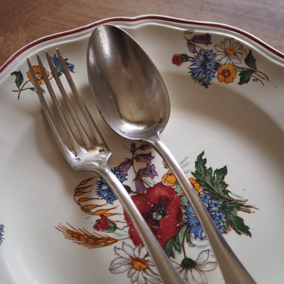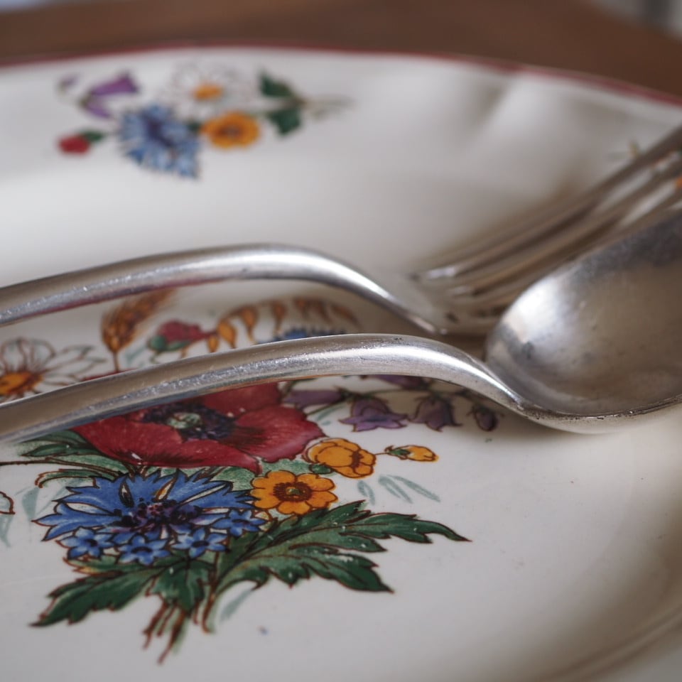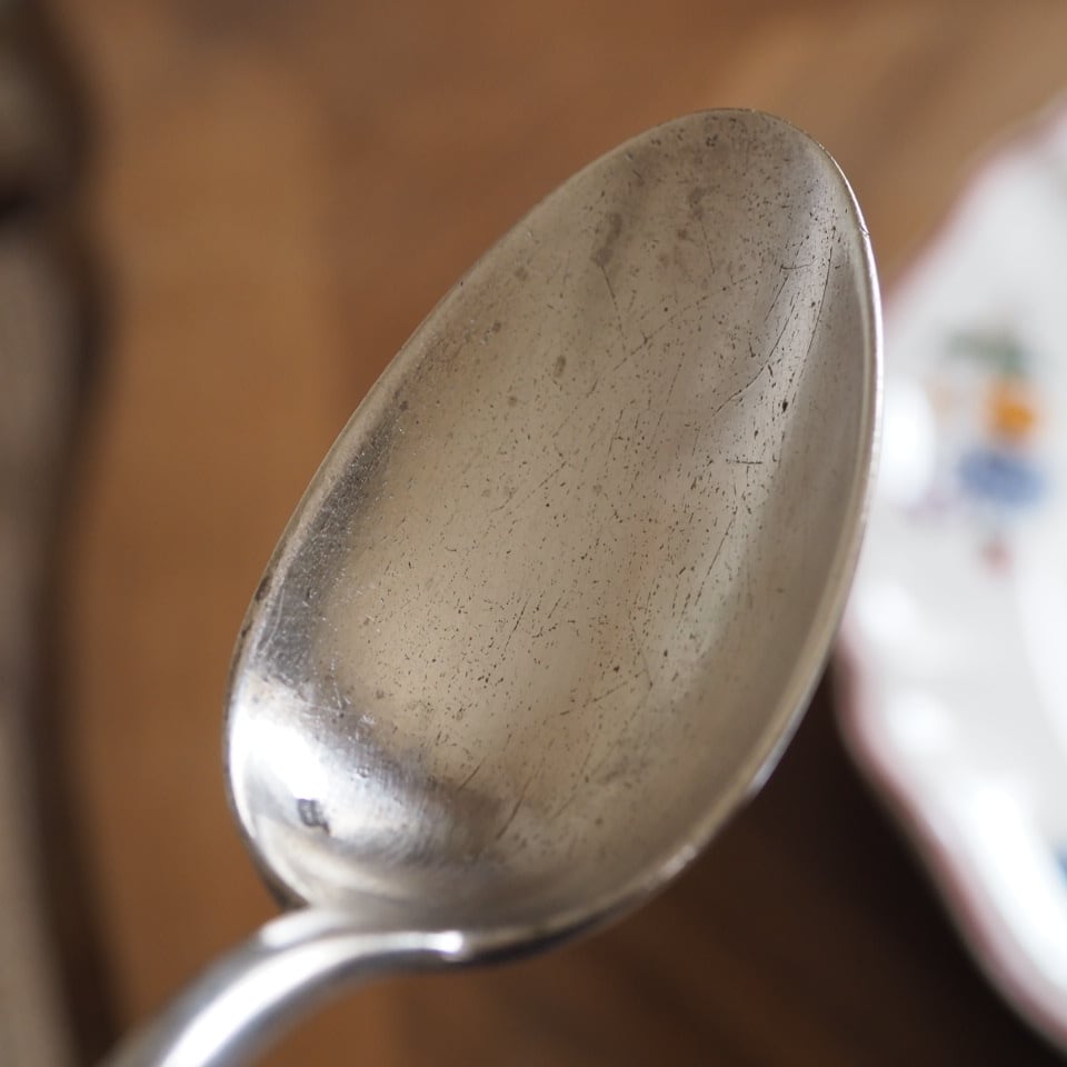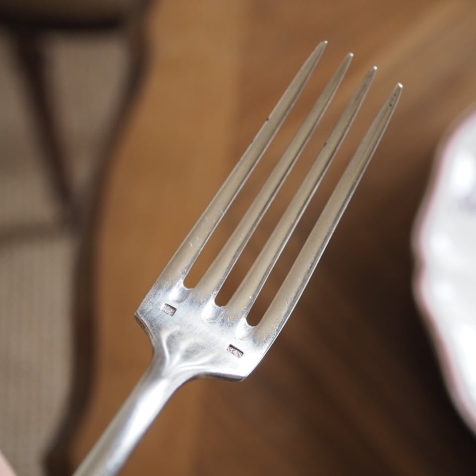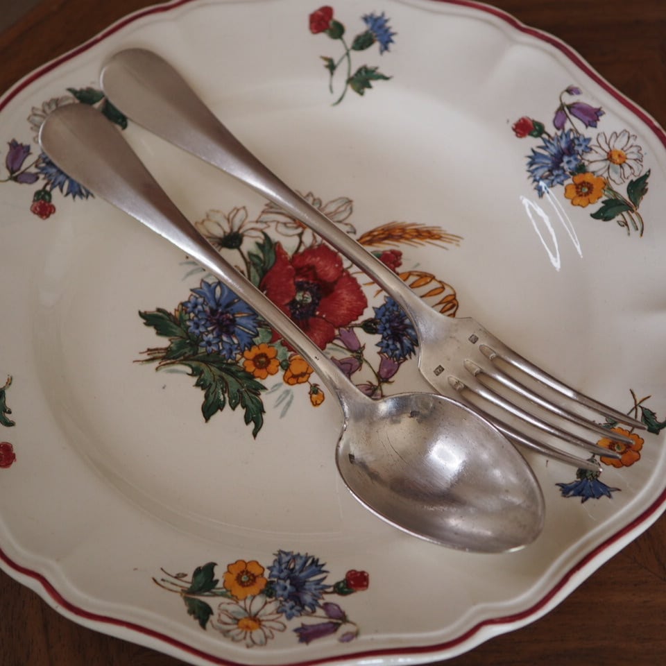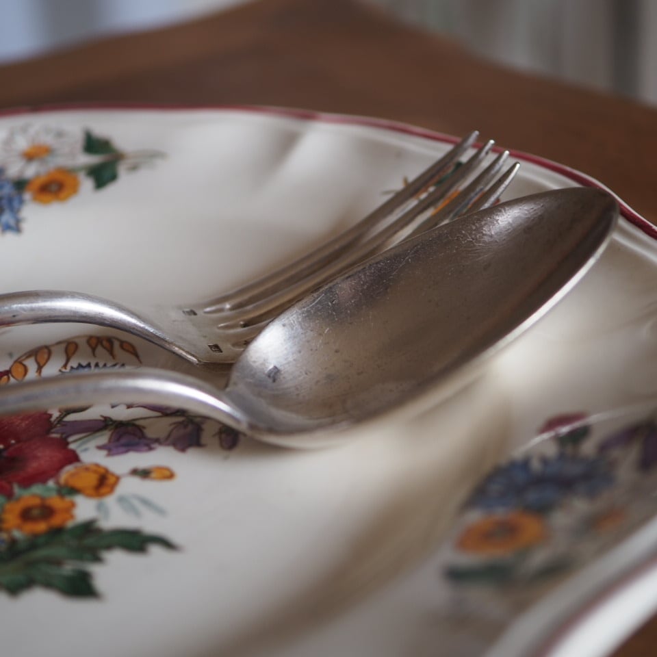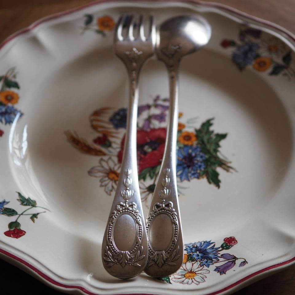 シルバープレートのカトラリー、フォークとスプーンのセット、もう一組をご紹介します。