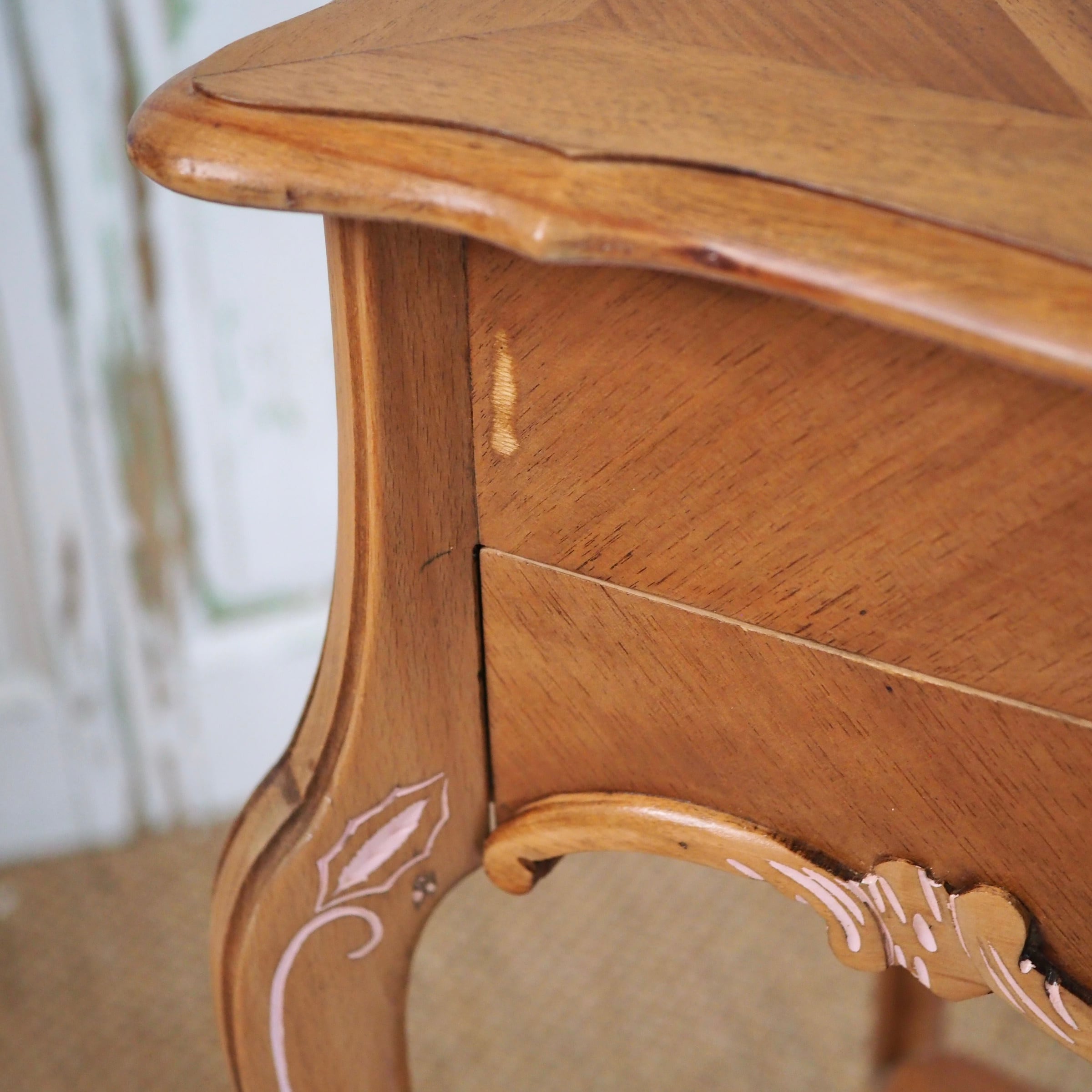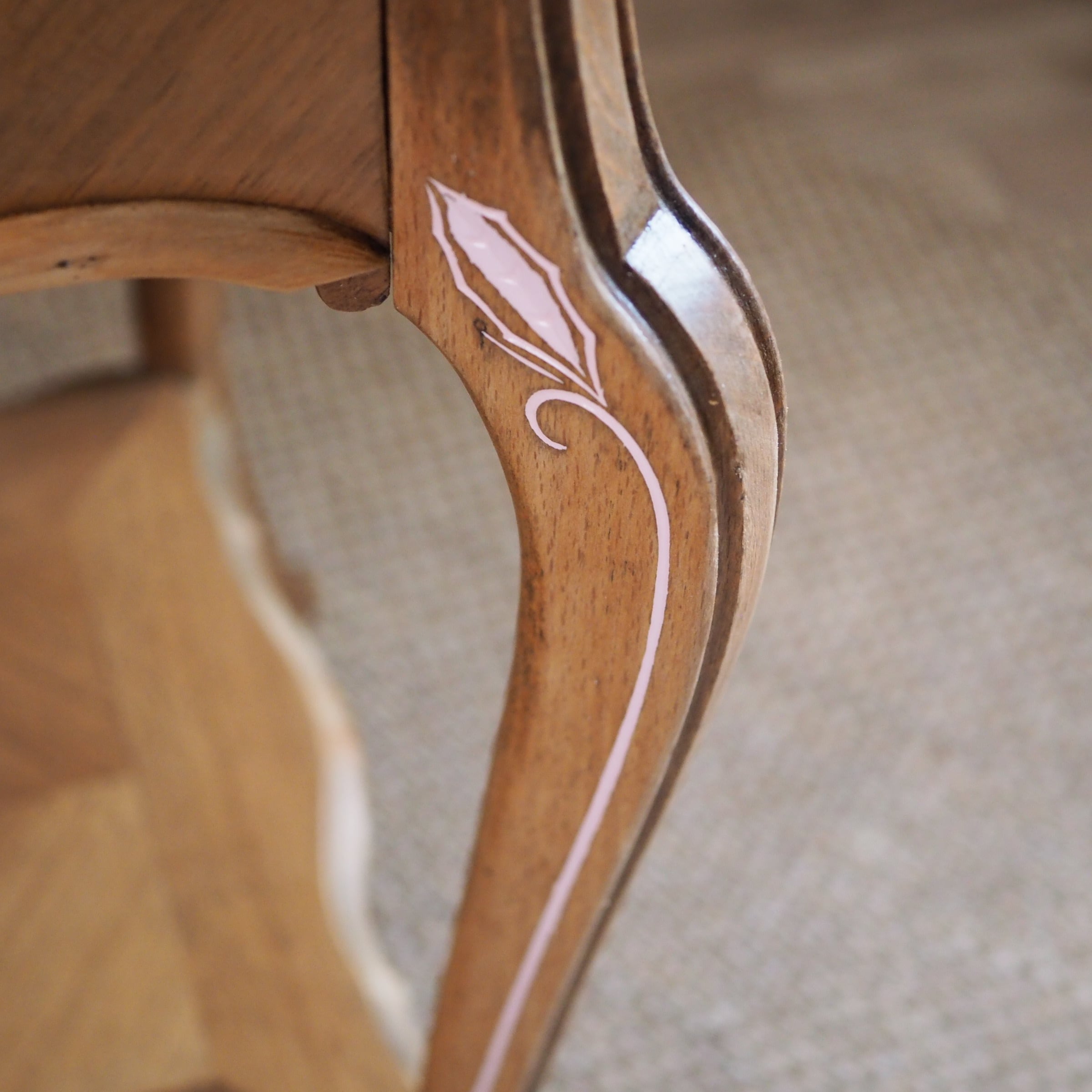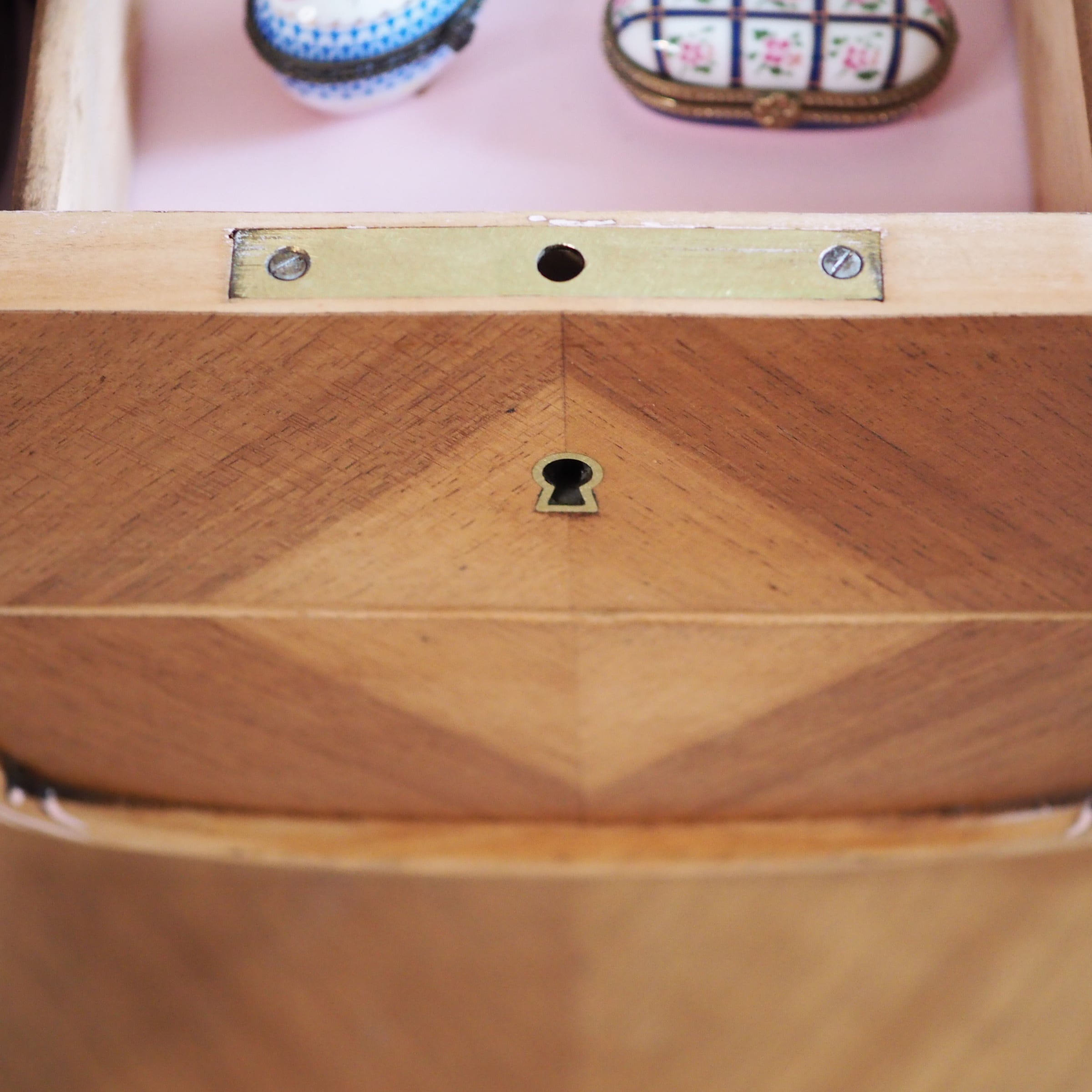 天板や側面、前面などの表面には寄木細工(マルケトリ)が施され、光の当たり方によって木目の表情が変わります。