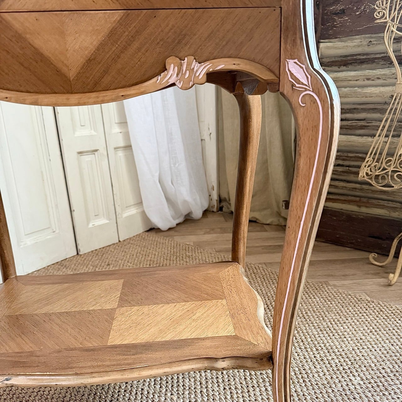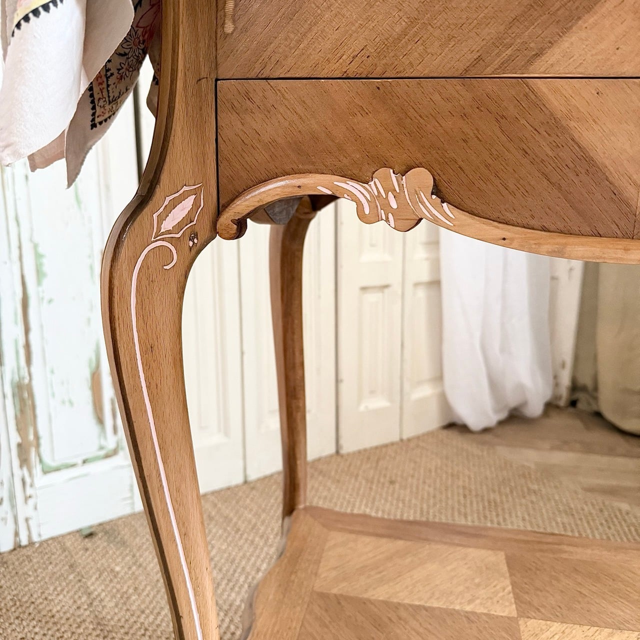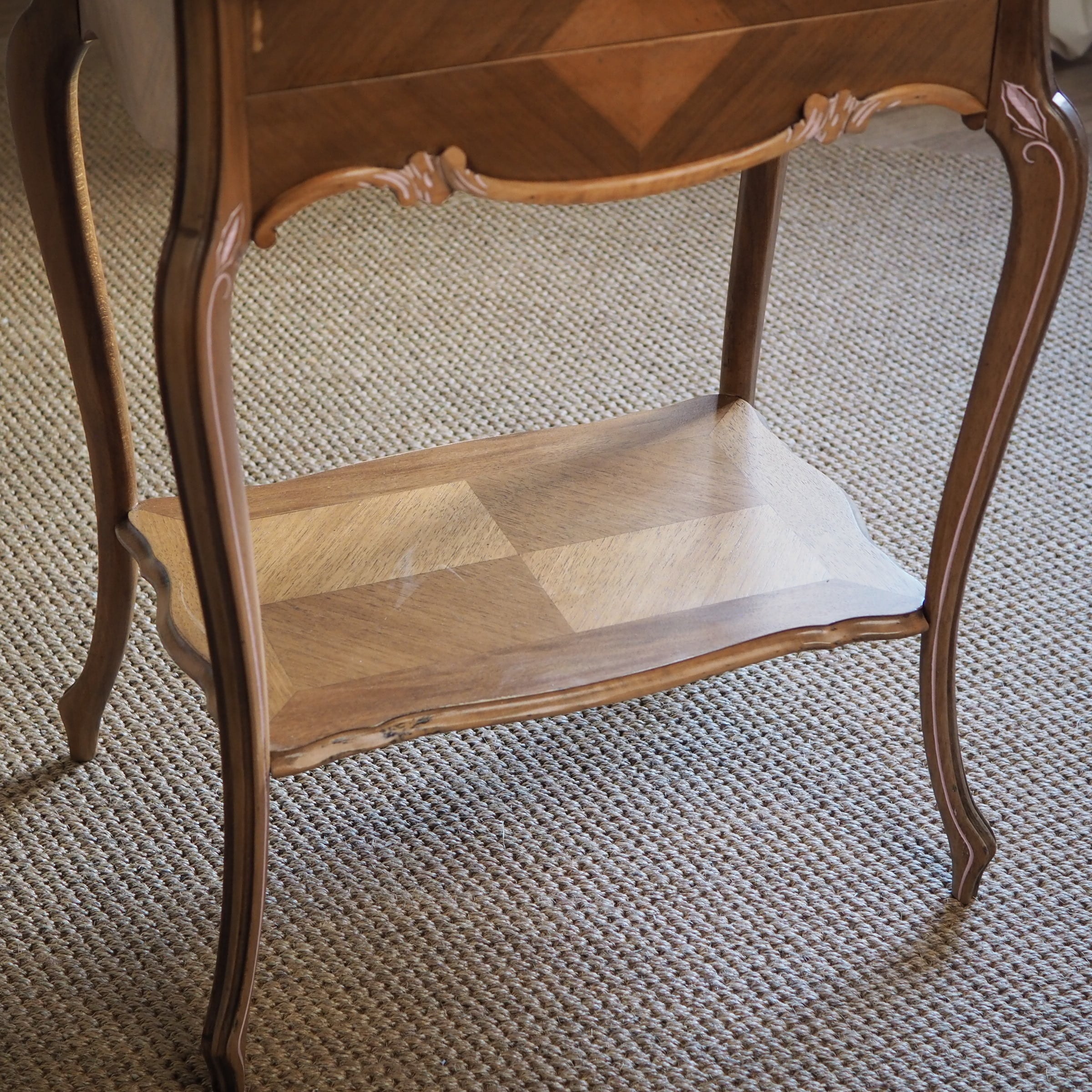 天板や側面、前面などの表面には寄木細工(マルケトリ)が施され、光の当たり方によって木目の表情が変わります。