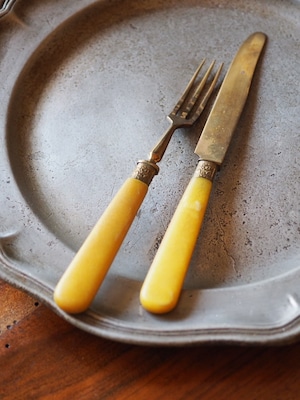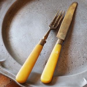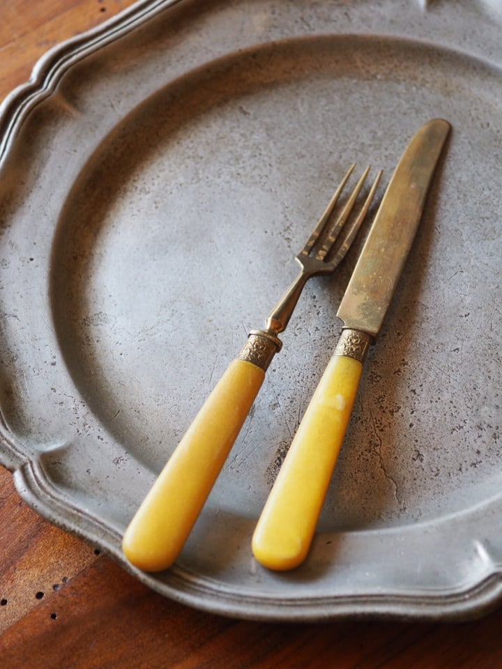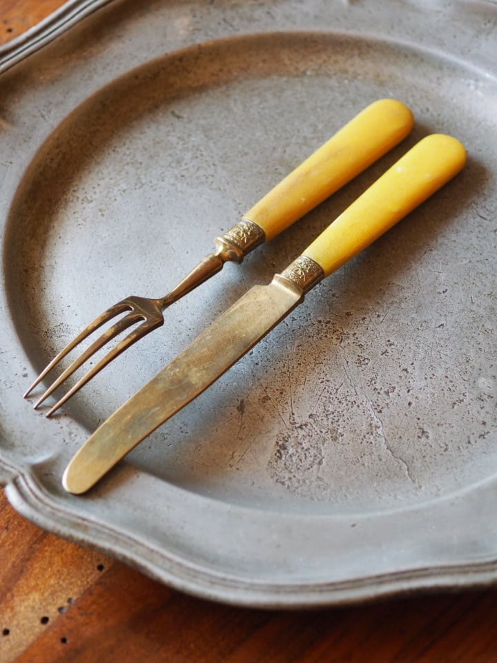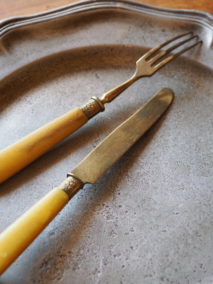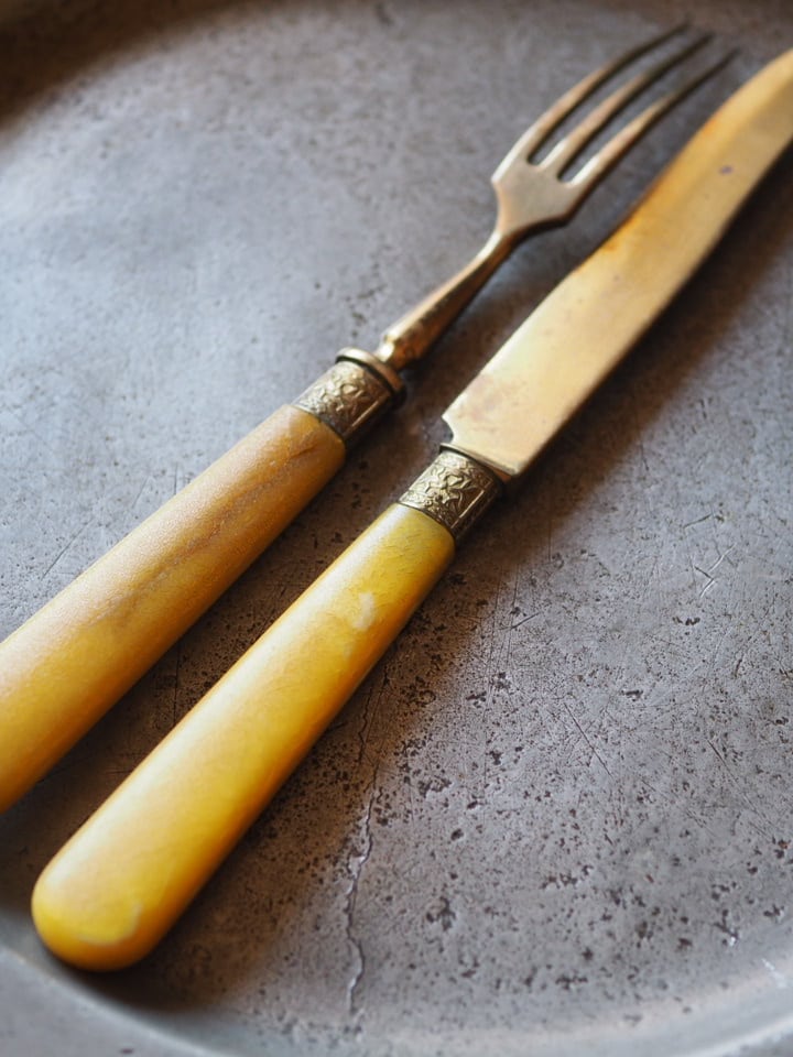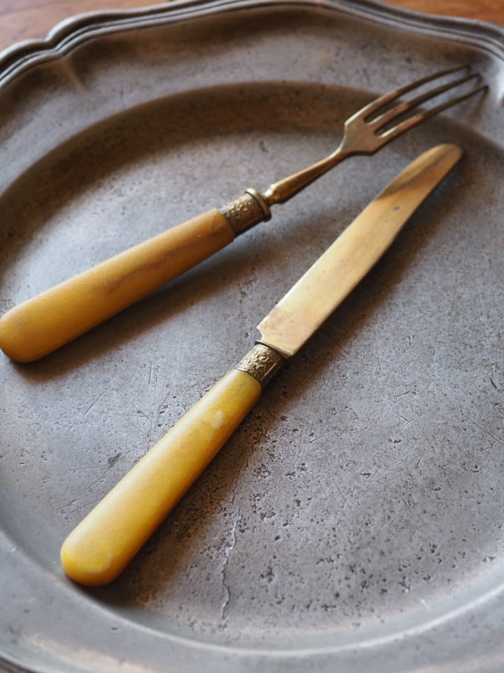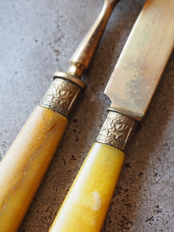 真鍮の刃とフォークに、飴色に艶を増したバケリートのハンドル——