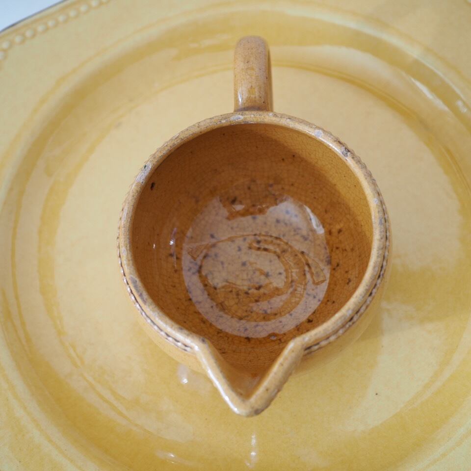 南仏プロヴァンスの窯ピションの古いピシェです。濃いめの黄色で、1、2枚目の写真の色調が近いです。コロンとしたフォルムが愛らしく、大きさ的にはカフェオレのミルクやドレッシングなどさまざまにお使いいただけるサイズ感。野の花やグリーンを挿してキッチンに置いておいてもかわいいですね。