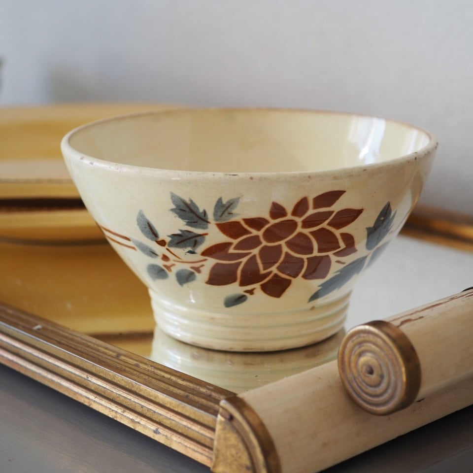 1900年代前半に作られた、ディゴワン・サルグミンヌの魅力的なカフェオレボウル。このカフェオレボウルのシリーズが好きで、柄違いをいくつか持っていますが、このフランス独特の配色がたまりません。濃いめのクリームの地にブルーグレーと深いボルドー。そして、台座の形はアール・デコの影響でしょうか。この台座の形はディゴワンだけのように思います。こちらのモチーフはダリアかな。