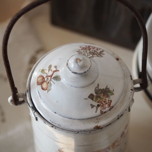 状態は良好です。絵柄も艶もきれいに残り、ホーロー特有のあたりは下部とふたに少しある程度です。前面、後ろ面ともにきれいな状態です。持ち手は錆びています。古いものにご理解の上お求めください。