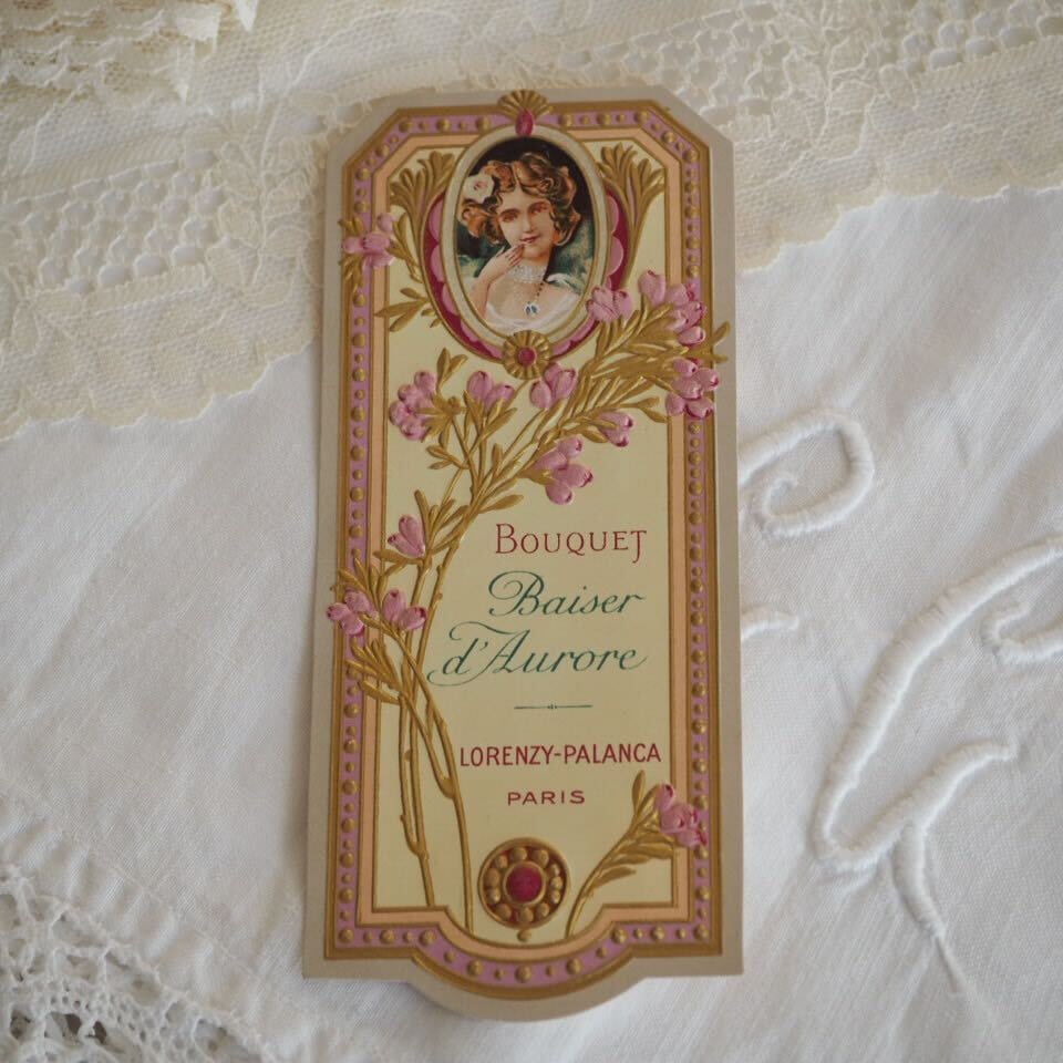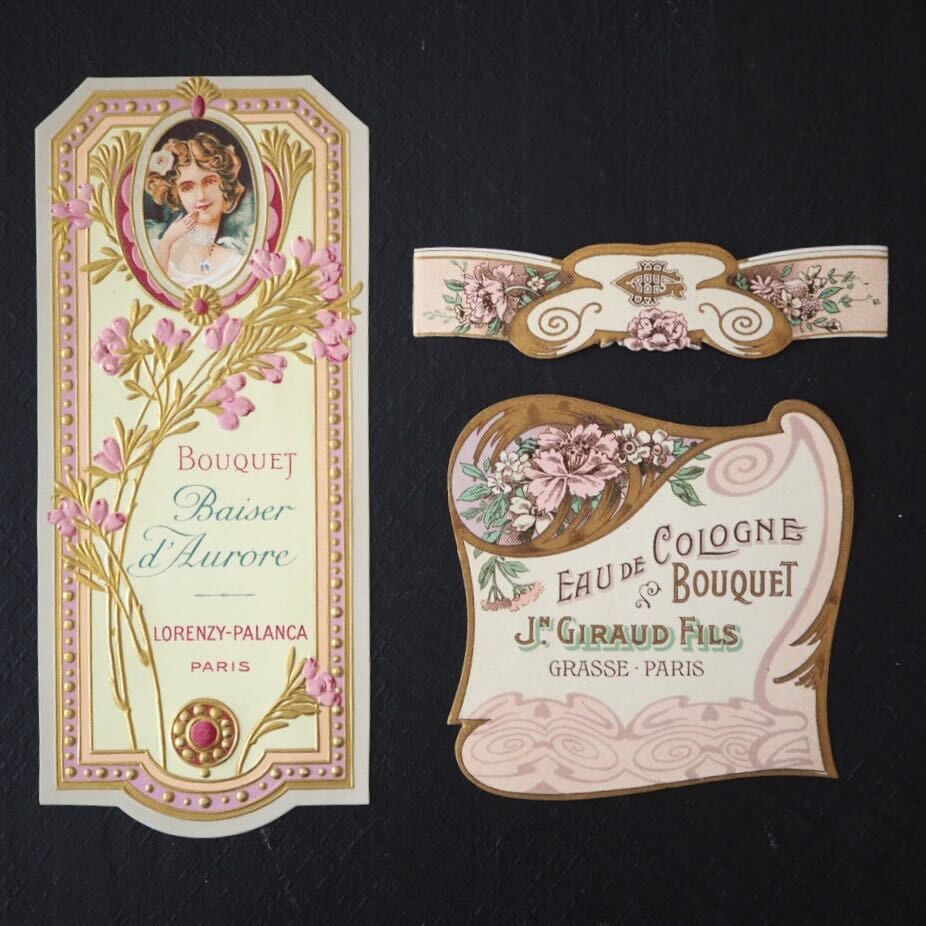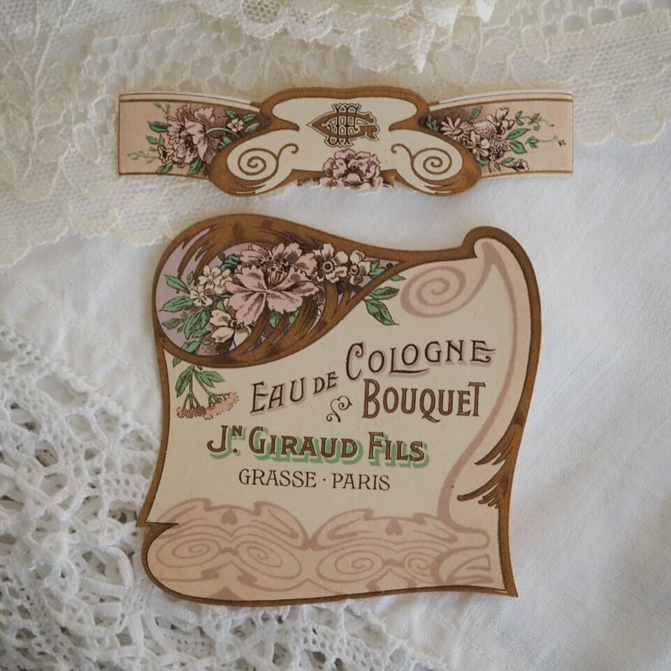 未使用品のパルファンのエチケット(ラベル)を2種セットにしました。一つはパリのLorenzy-Planca。凹凸のある浮き彫り印刷でかなりの高級感があります。もう一つはグラースとパリに本拠地をもつJn.Giraud Filsのオーデコロンのエチケット。こちらは2枚1組。淡いピンクと茶の配色が上品でフランスっぽい!