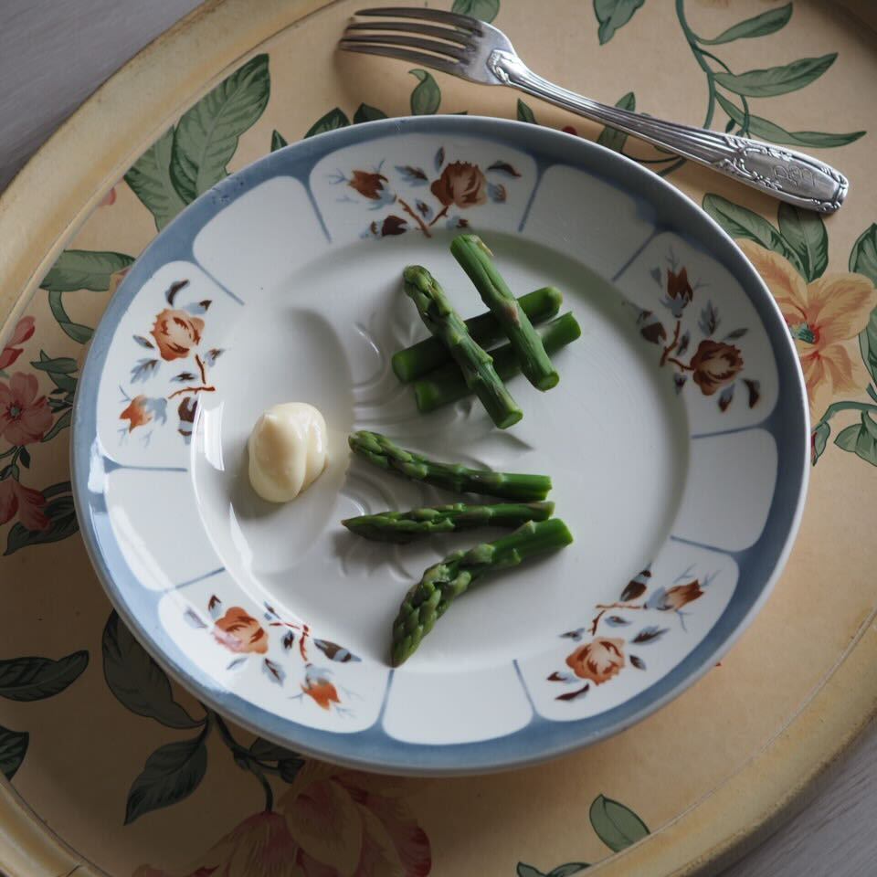 といっても、通常のアスパラガスプレートのようにアスパラを並べる仕切りがないので、和食にもぴったりなんです。ソースを入れるくぼみがあるので、お刺身やお寿司と醤油、焼き海苔と醤油、コロッケとソース、こんにゃくと胡桃味噌、かまぼことわさび漬け(キリがない)というように、まさに日本人のために作られたんじゃないかと思うくらい大活躍まちがいなしのプレートです。