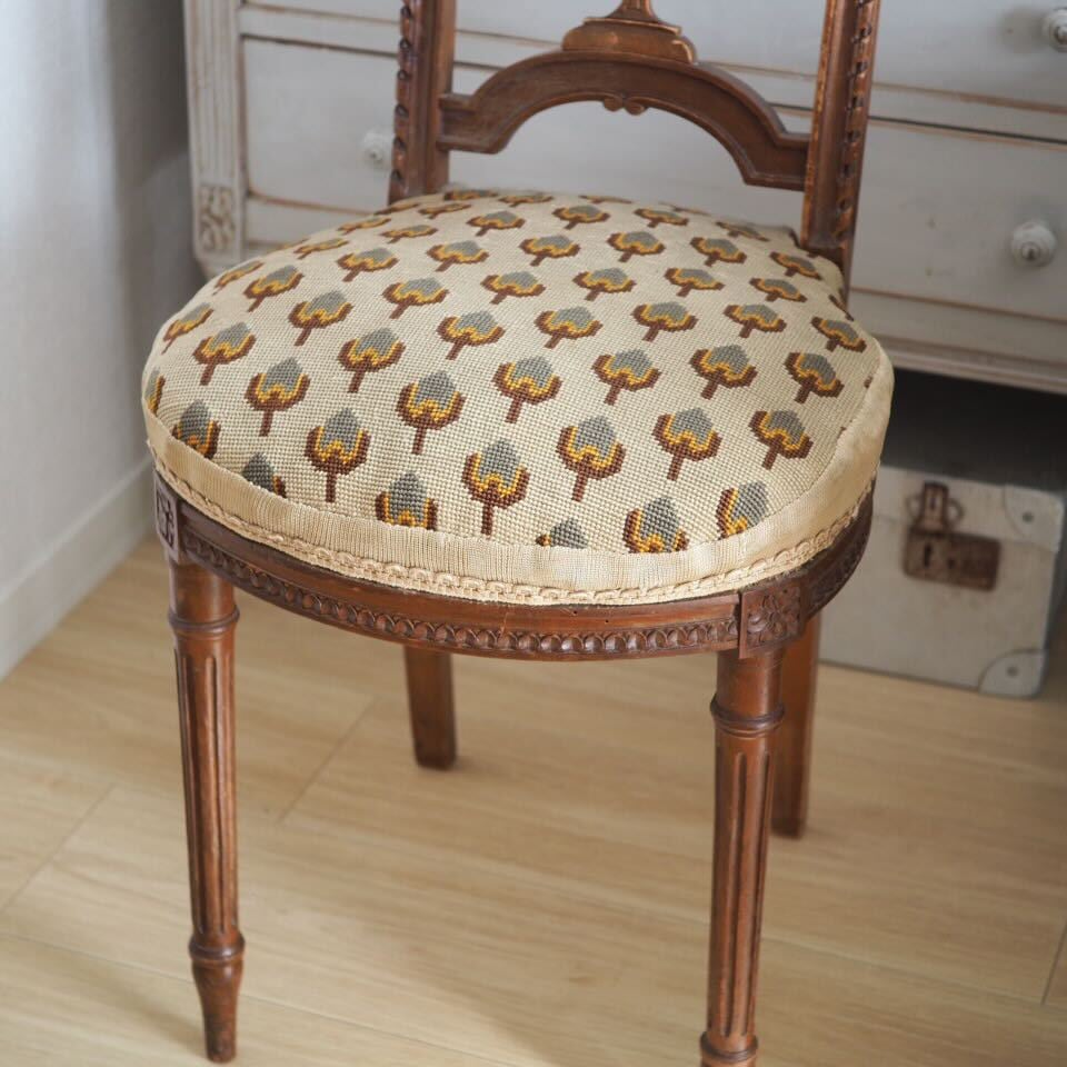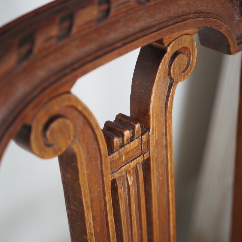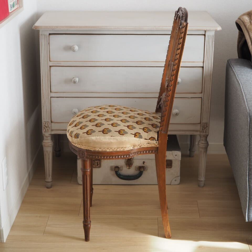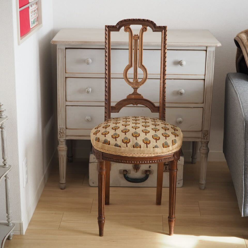 小さめですが、装飾は家具職人と彫刻職人によるこだわりのハープモチーフで、存在感があります。美しい彫刻とアンティークならではの存在感がある、音楽を愛するフランス人が作ったアンティークチェアです。
