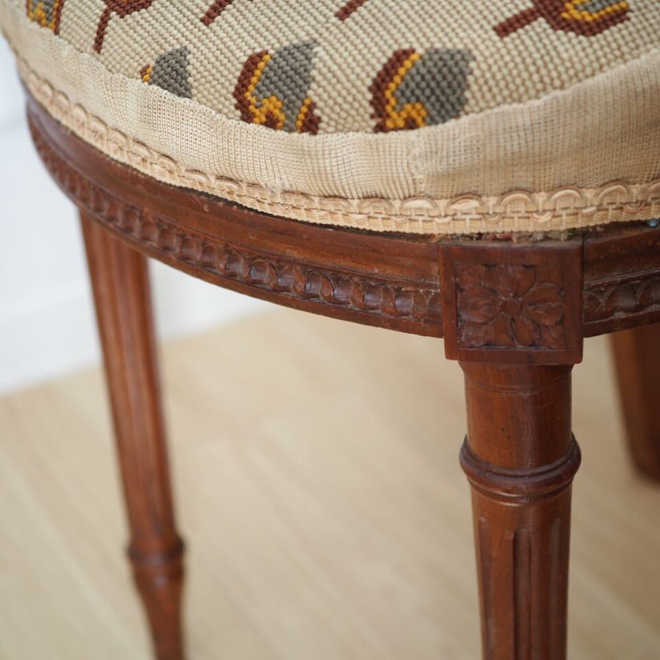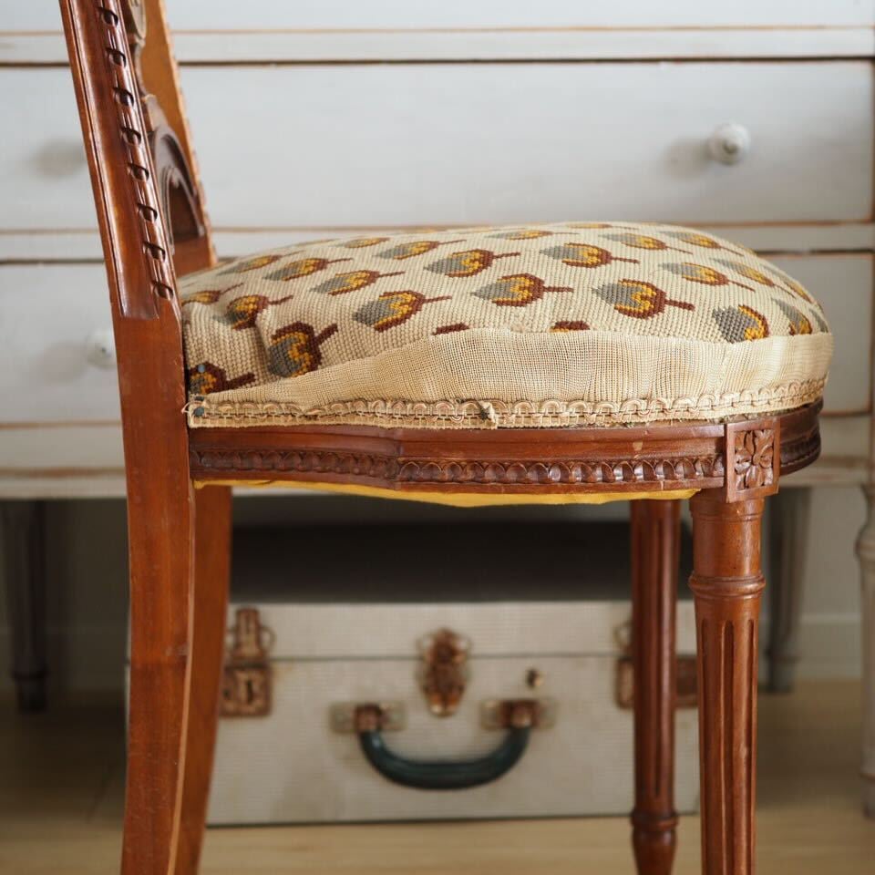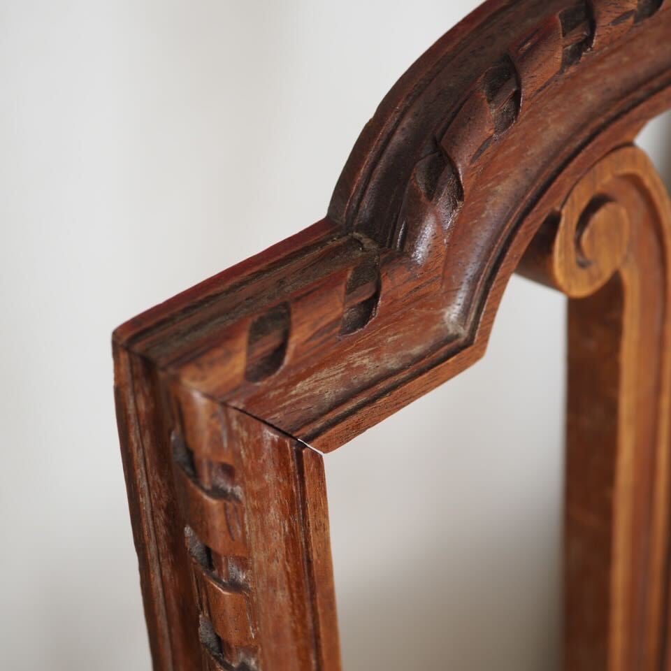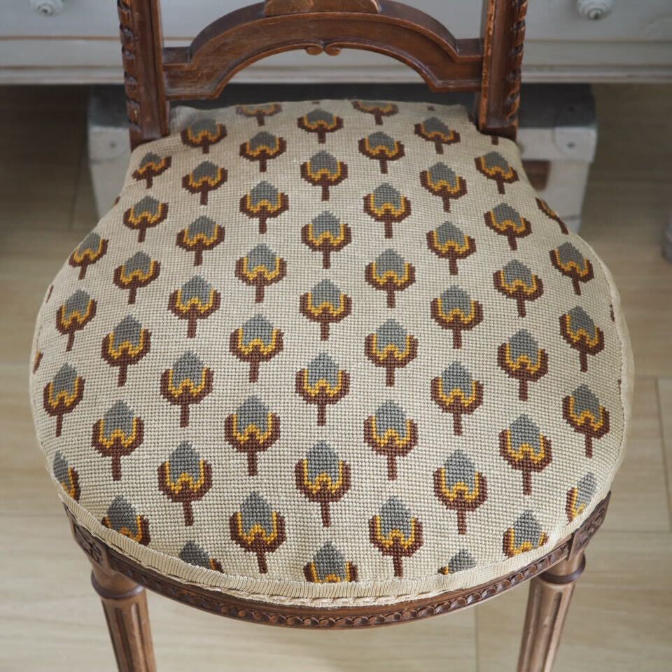 小さめですが、装飾は家具職人と彫刻職人によるこだわりのハープモチーフで、存在感があります。美しい彫刻とアンティークならではの存在感がある、音楽を愛するフランス人が作ったアンティークチェアです。