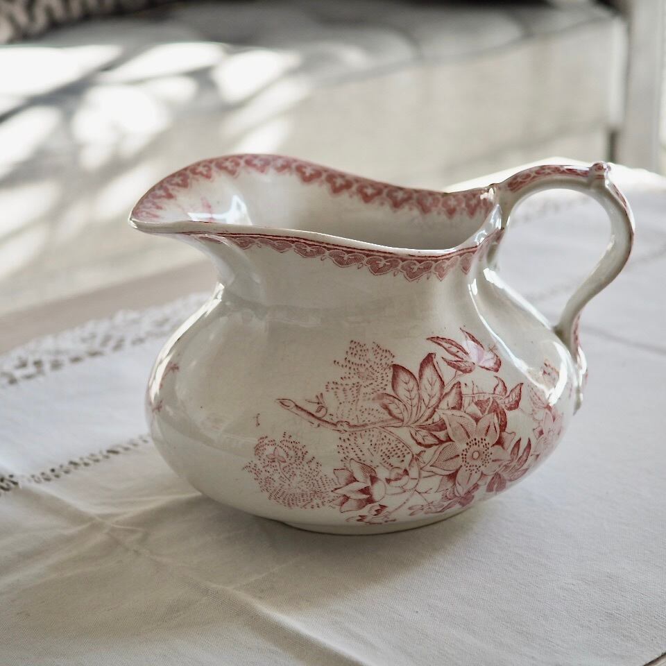 カオリンや長石が多く加えられた陶器(半陶半磁器)をTerre de fer テール・ド・フェールと呼びます。19世紀後半に量産されました。より白く、より頑丈にと作られたものです。このピシェにも裏に"Terre de fer"と記されています。