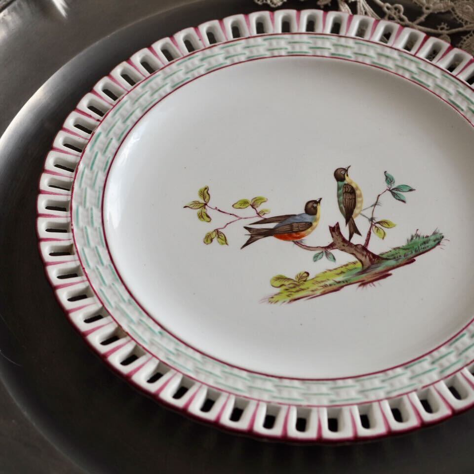 フランスの名窯リュネヴィルK&G時代の、かわいい19世紀末頃のアンティークプレート。マリーアントワネットも愛した由緒正しい窯リュネヴィルのデザート皿です。こちらはとても珍しい小鳥の絵柄。カラフルな美しい小鳥です。一点一点絵柄が違って楽しいです。