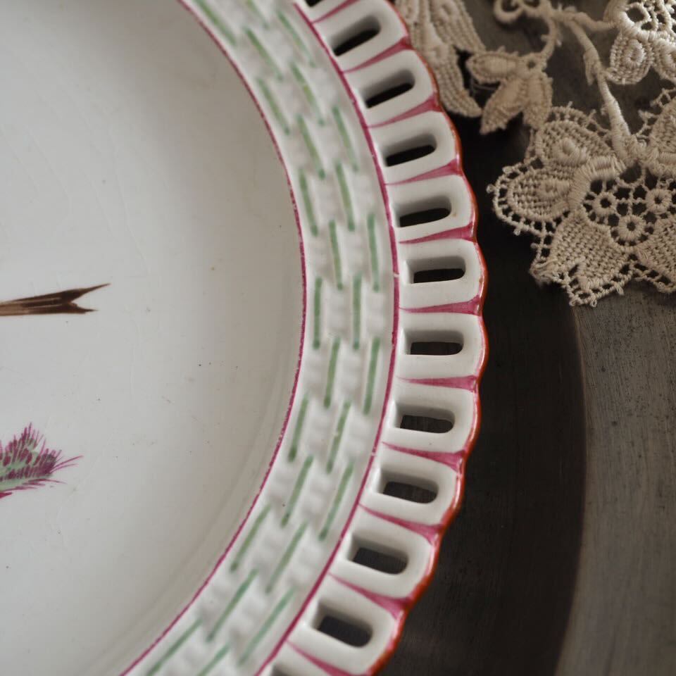 フランスの名窯リュネヴィルK&G時代の、かわいい19世紀末頃のアンティークプレート。マリーアントワネットも愛した由緒正しい窯リュネヴィルのデザート皿です。こちらはとても珍しい小鳥の絵柄。カラフルな美しい小鳥です。一点一点絵柄が違って楽しいです。