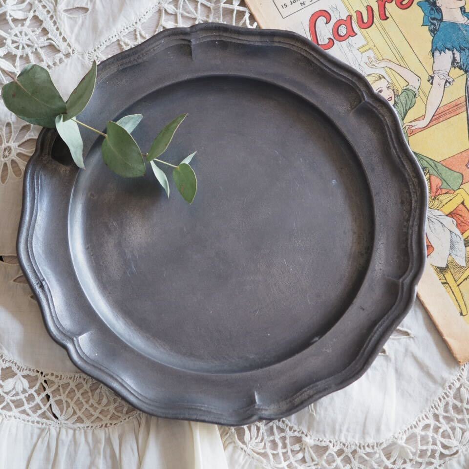 ピューター(錫)のアンティークプレートをご紹介します。重厚感のあるピューター(フランスではエタンといいます)ですが、波打つ花リムがやさしい雰囲気を加えてくれます。