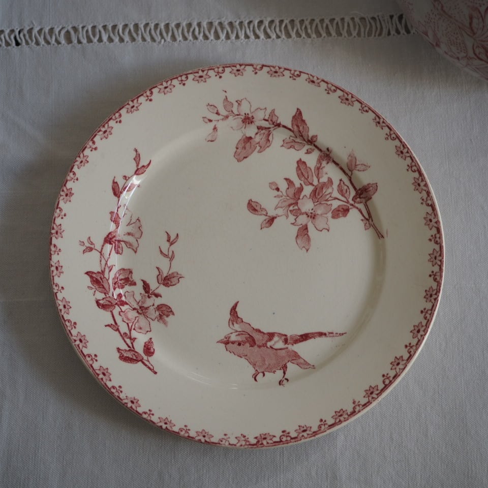 空を羽ばたく小鳥と桜の花、赤の色調が可憐なプレートです。アイボリーの陶肌もやさしいイメージ。ガーランドの縁取り文様も素敵です。