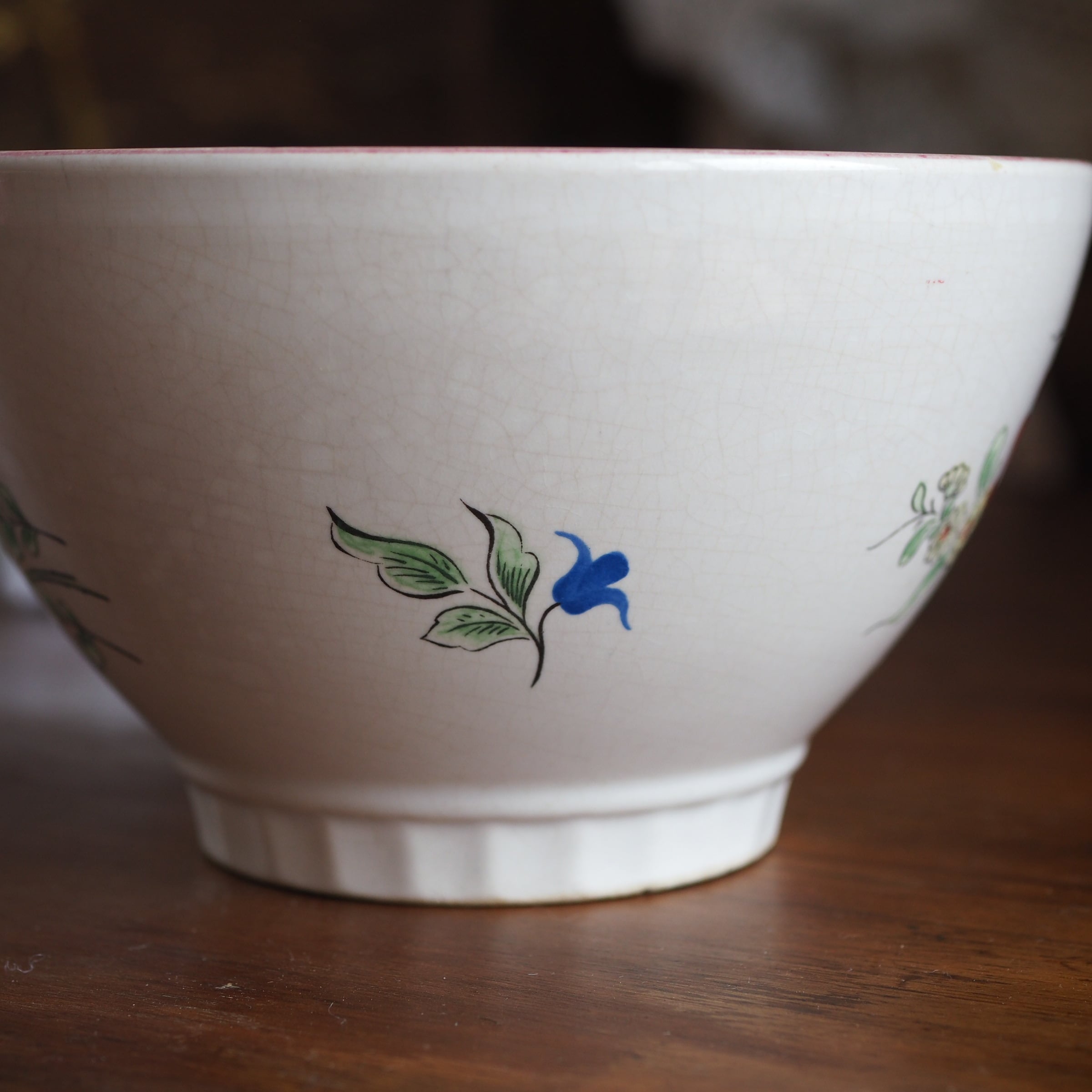 全体に貫入からのシミができています。縁取りのピンクもかすれていますが、アンティークらしい素敵な佇まいになっています。
