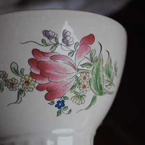マリーアントワネットも愛した由緒正しいフランスの名窯リュネヴィルのカフェオレボウル。KG時代の古いものです。標準的なサイズ感です。チューリップがメインのブーケと、バラがメインのブーケが大きく配されています。レアなお品です。