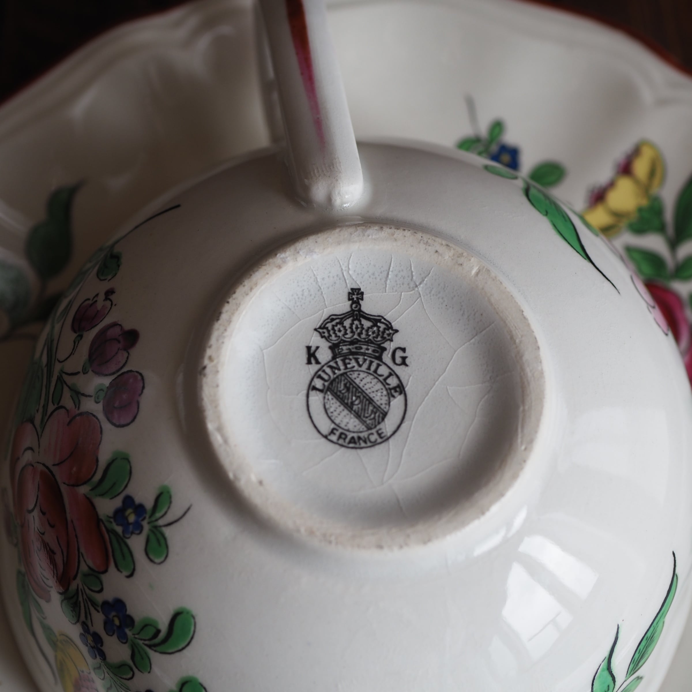 王室御用達だった、由緒正しいフランスの名窯リュネヴィルのティーカップとソーサーです。バラがメインのブーケが大きく配されています。フランスではデミタスが多いので、ティーカップはとても少ないです。