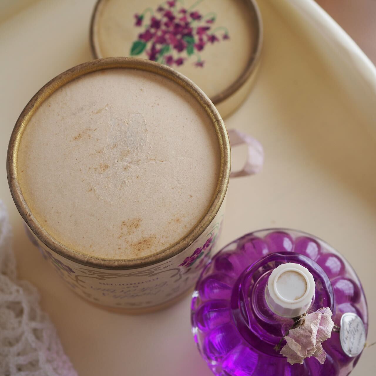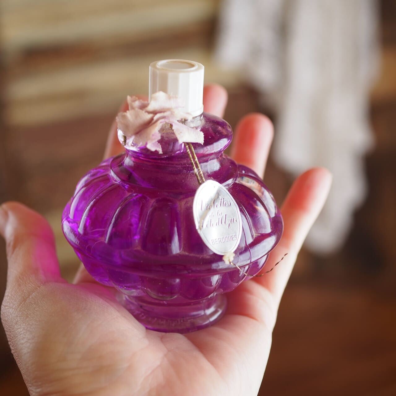 古き良き時代の香水瓶にすみれ色の香水が当時のまま入っている、貴重な未使用品です。美しいイラストのオリジナル箱も素敵です。フランスでも、箱だけ、あるいは空の香水瓶だけでの売買もされるほど、コレクターが多いアイテムです。