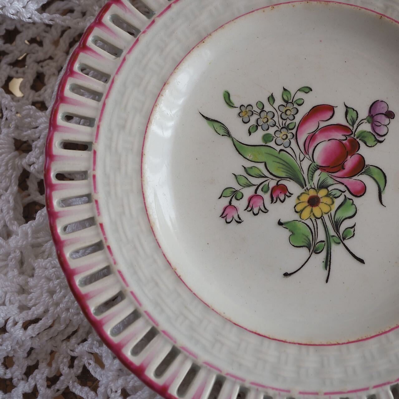 フランスの名窯リュネヴィルのかわいいアンティークプレート。バラやチューリップなど春の花が描かれたカラフルなハンドペイントの色付け絵皿シリーズ"Réverbère" です。ピンクで縁取られています。縁取りもハンドペイントです。
