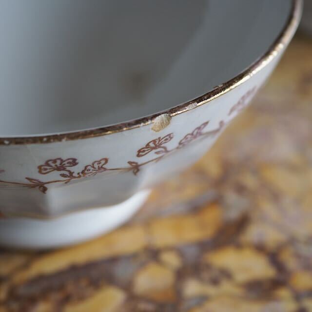 直径11,5cmのかわいいプチカフェオレボウルを2個セットにしました。小さなカフェオレボウルは2個そろっていると可愛さ倍増なのです。控えめな金彩と花の絵がとても愛らしいビンテージの器です。