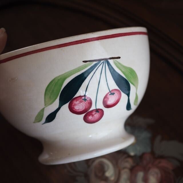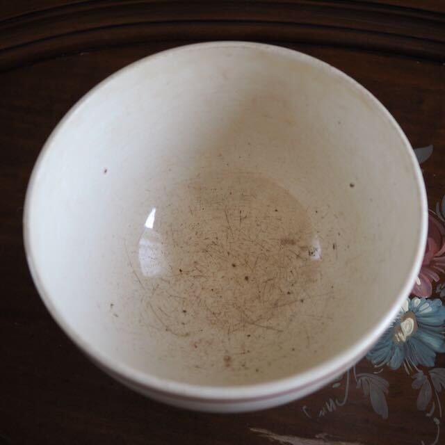 これはもう、カフェオレボウルとは呼べないかも……大きくて、これでカフェオレを飲んだらそれだけでお腹いっぱい。じつはこの大きさだけで、かなり古いものとわかります。年代が降ると、こんな大きなカフェオレボウルは作られていません。そして、内側のカトラリー傷。この傷が物語っているのは、この器はスープ皿として使われていたという歴史。1900年頃のものだと思われます。