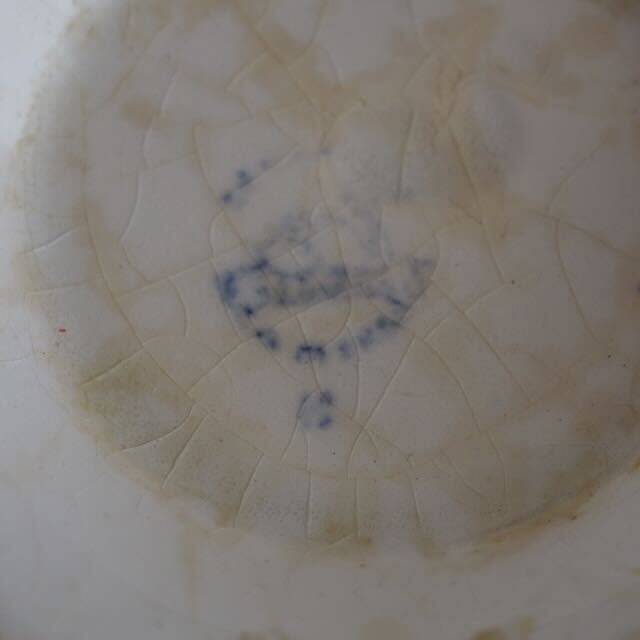 経年からの貫入によるシミができています。内側にはカトラリー傷がたくさんあります。外側に制作時についたと思われる傷があります。欠けやヒビはありません。
