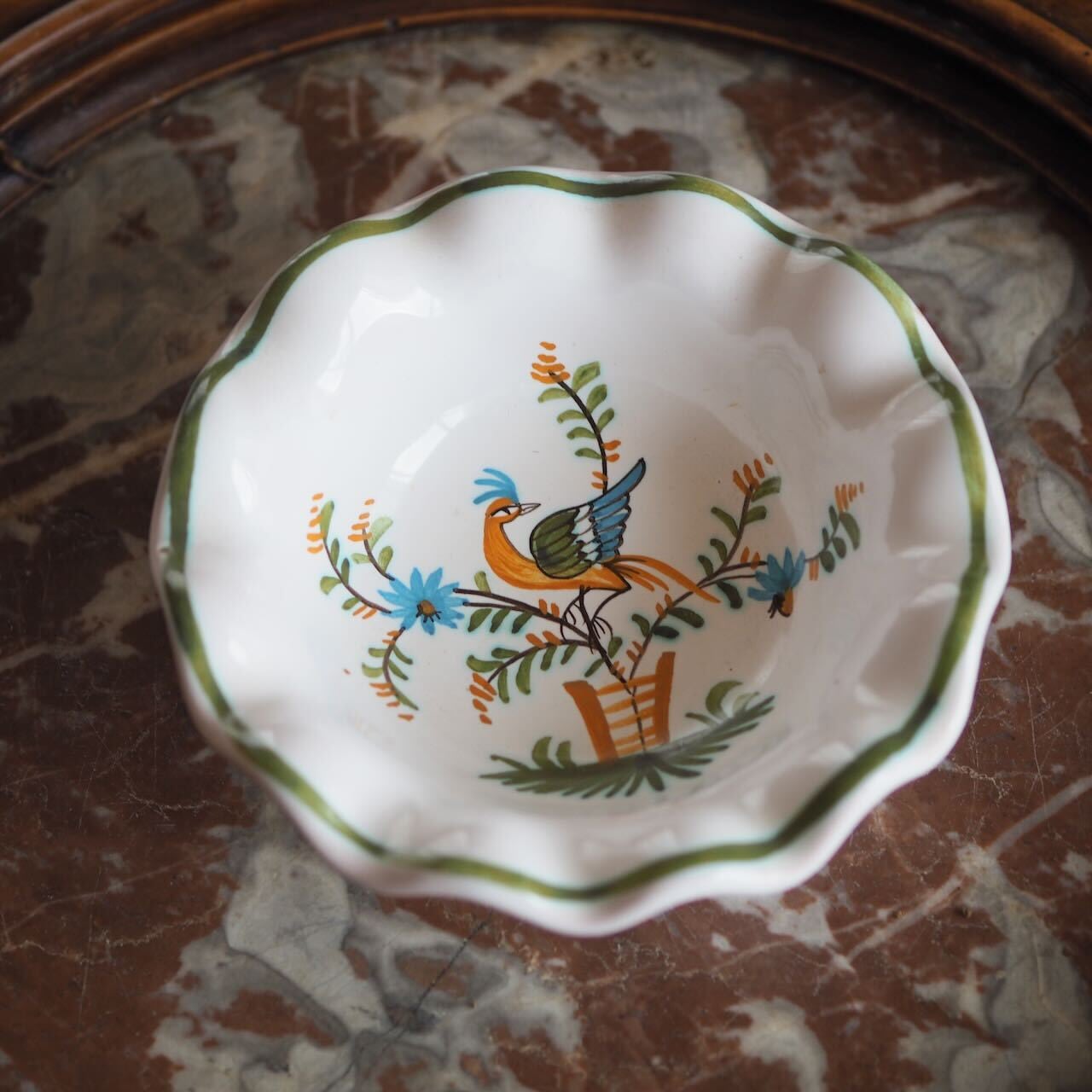 フリルのように波打つ形がとても素敵な器です。南仏のムスティエ焼。南仏のブロカント市で見つけました。ムスティエの窯ラリエのハンドメイドです。