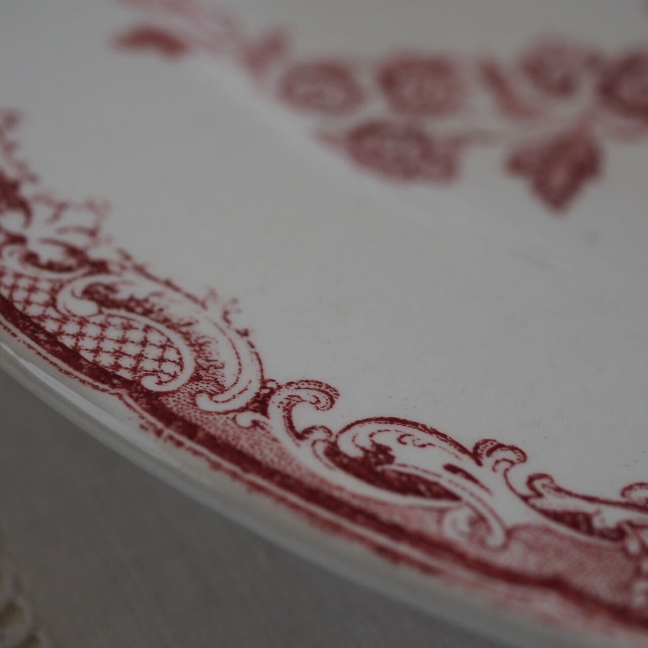 自然光の影響で赤みがかって見える写真がありますが、色は白です。大変よいコンディションです。カトラリー傷が少しと、裏面に釉薬のムラが見られる程度ですが、古いものなので経年による多少の傷やスレなどはあり、それもアンティークの良さとして楽しんでいただけたら嬉しいです。