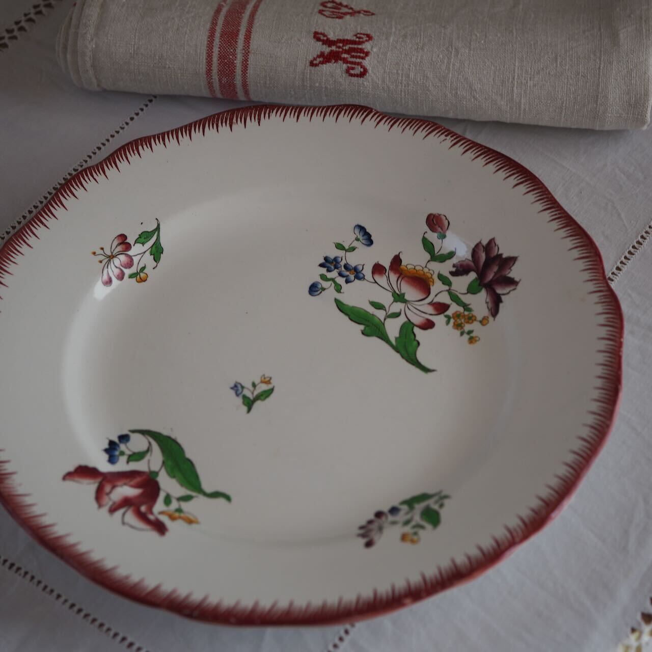 サルグミンヌU&C時代の古いアンティークプレート「ストラスブール」です 。1900年頃。軽やかな絵柄。カラフルなお花のシリーズですが、縁取りのボルドー色がシックで大人な雰囲気を醸しています。絵柄違いの2枚組。