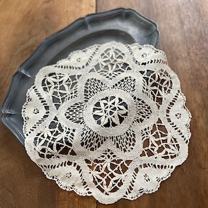 やさしいエクリュのクロシェレースドイリーです。インテリアのエレガンスをワンランクアップしてくれる、とびきりのアイテムです。