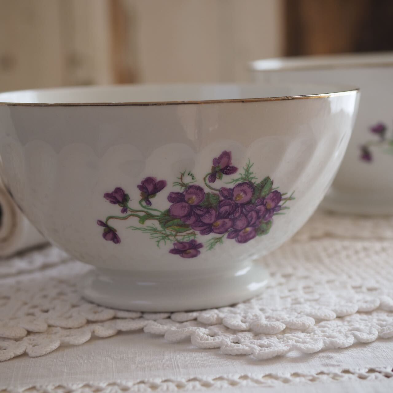 スミレのブーケが両面に描かれたカフェオレボウルです。直径12,5cmで、一般的な大きさのカフェオレボウルよりひとまわり小さめサイズ。磁器。