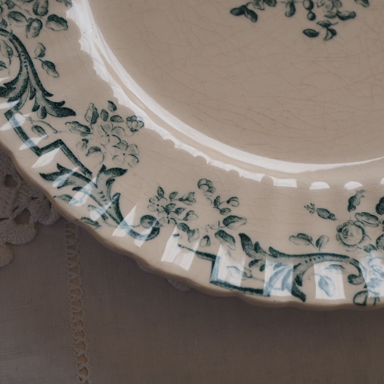 ロンシャンのプレートの魅力は、色とレリーフ、エレガントな絵柄です。こちらのプレートも、他ではあまり見ることのできない青緑のような色調。そしてたっぷり幅をとったリムにはお得意のレリーフが入っており、それが光に反射してはっとするほど美しいです。ルネッサンスのイタリア絵画の庭園を思わせるような絵柄にも見惚れてしまいます。