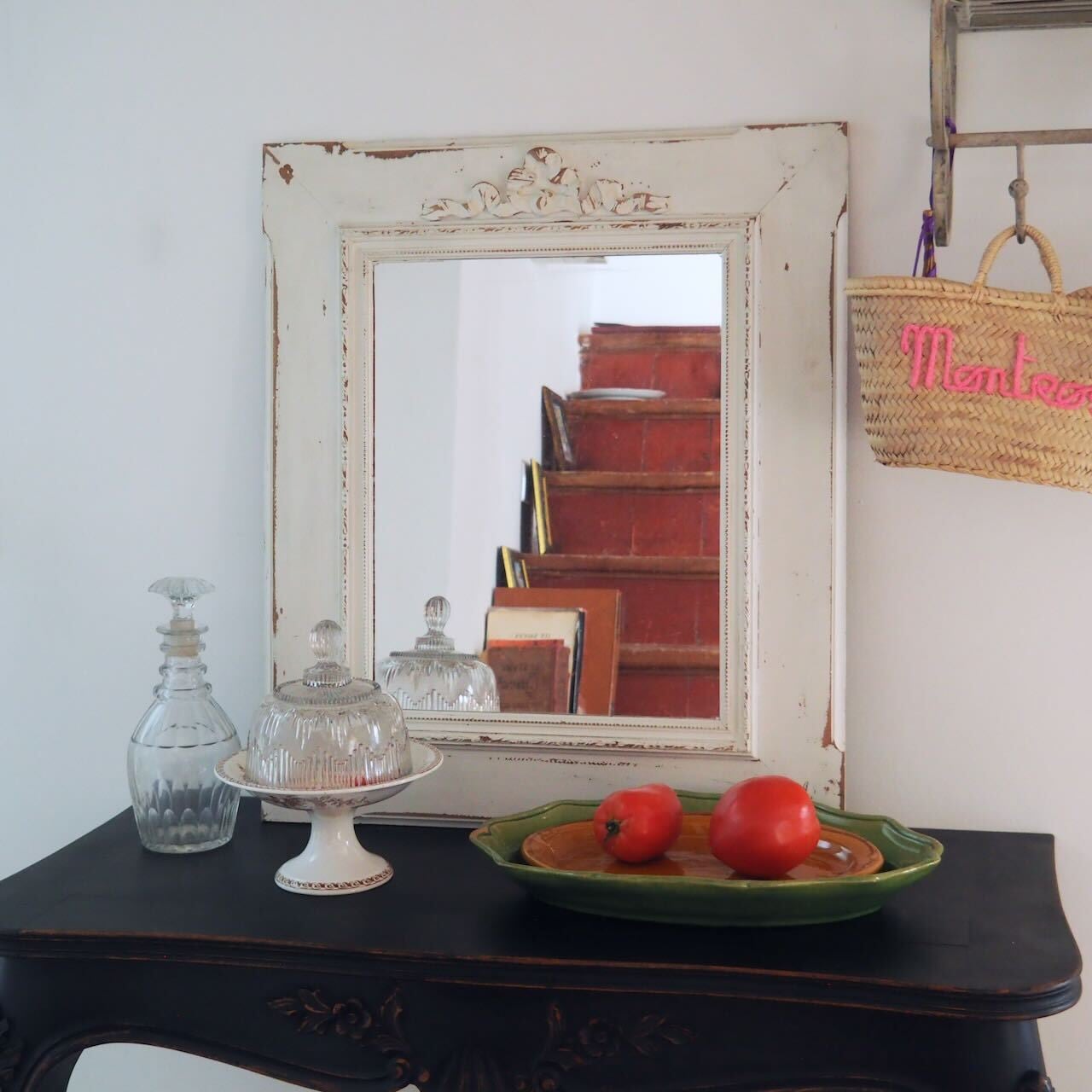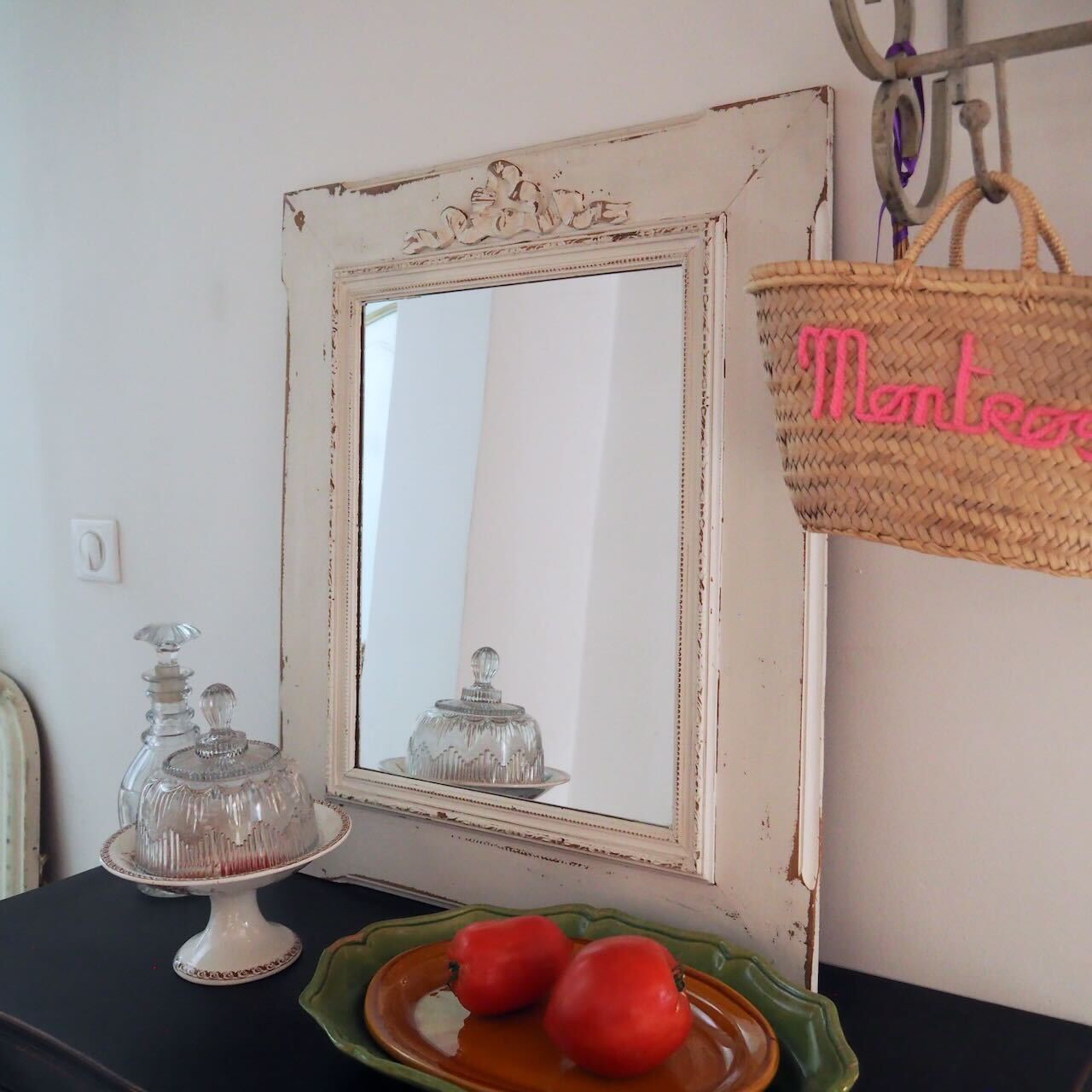 木製のフレームにオフホワイトでペイントされた、とても雰囲気のあるミラーです。
