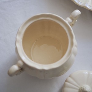 アイボリーの造形的なシュクリエ(シュガーポット)。サルグミンヌの花リムシリーズのシュクリエです。フォルムがぽってり愛らしく、かつエレガントなのが魅力です。細部までデザインにこだわりが見られ、ふたの掴みは松ぼっくりを模っています。