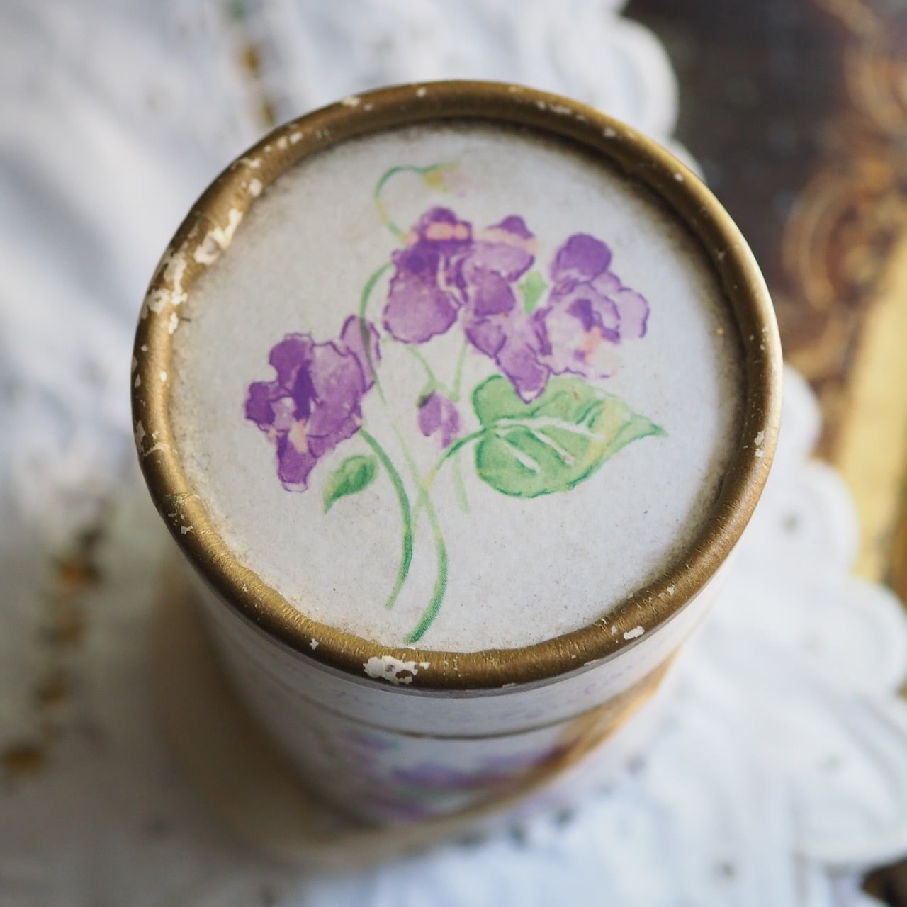 古き良き時代の香水瓶にすみれ色の香水が当時のまま入っています。美しいイラストのオリジナル箱も素敵です。フランスでも、箱だけ、あるいは空の香水瓶だけでの売買もされるほど、コレクターが多いアイテムです。こちらは当時の説明書もそのまま入っています。