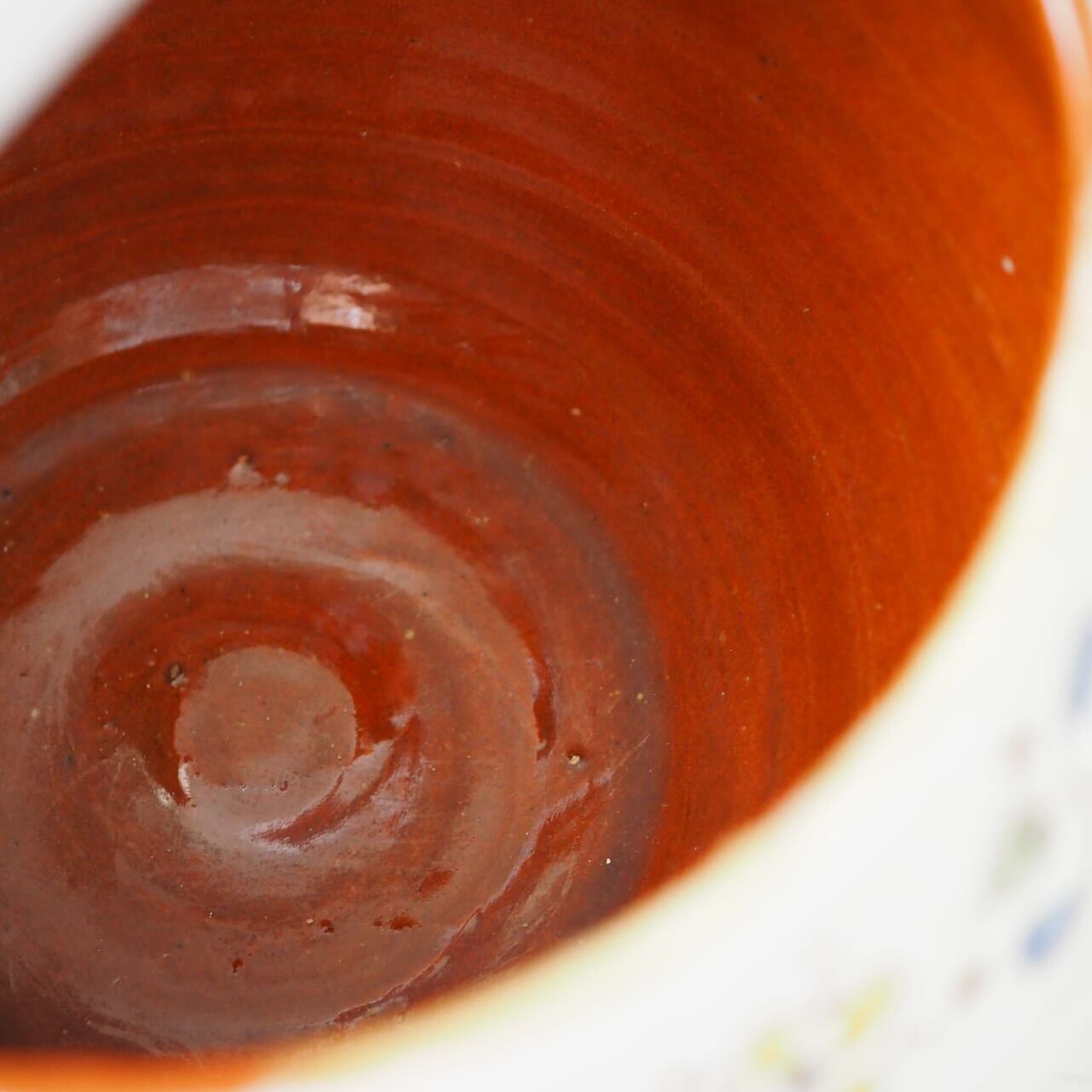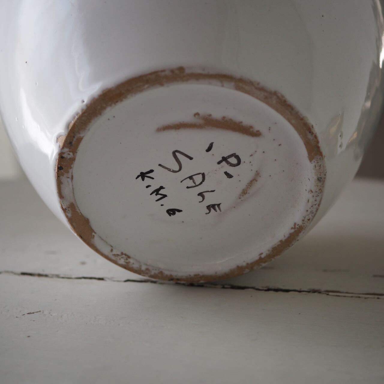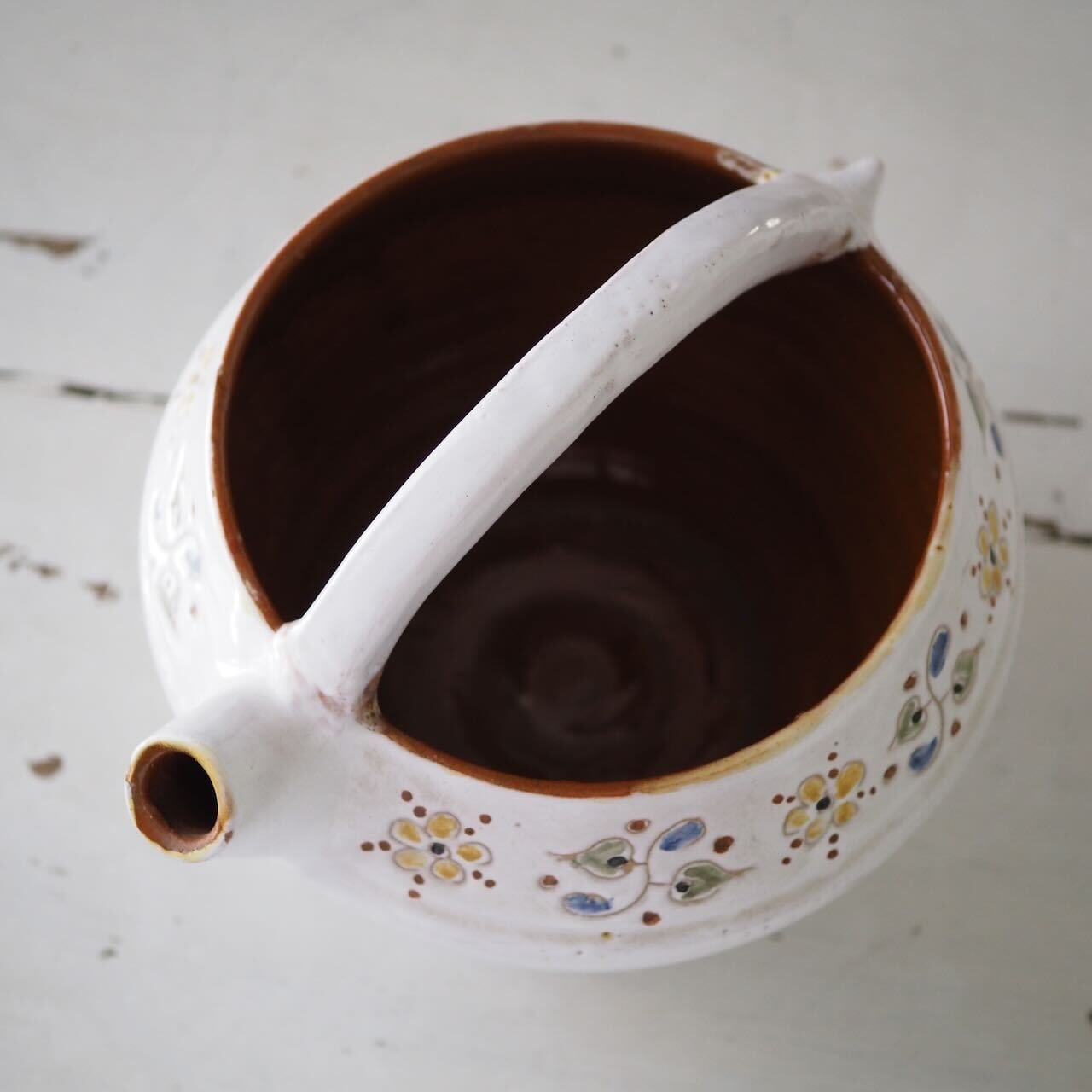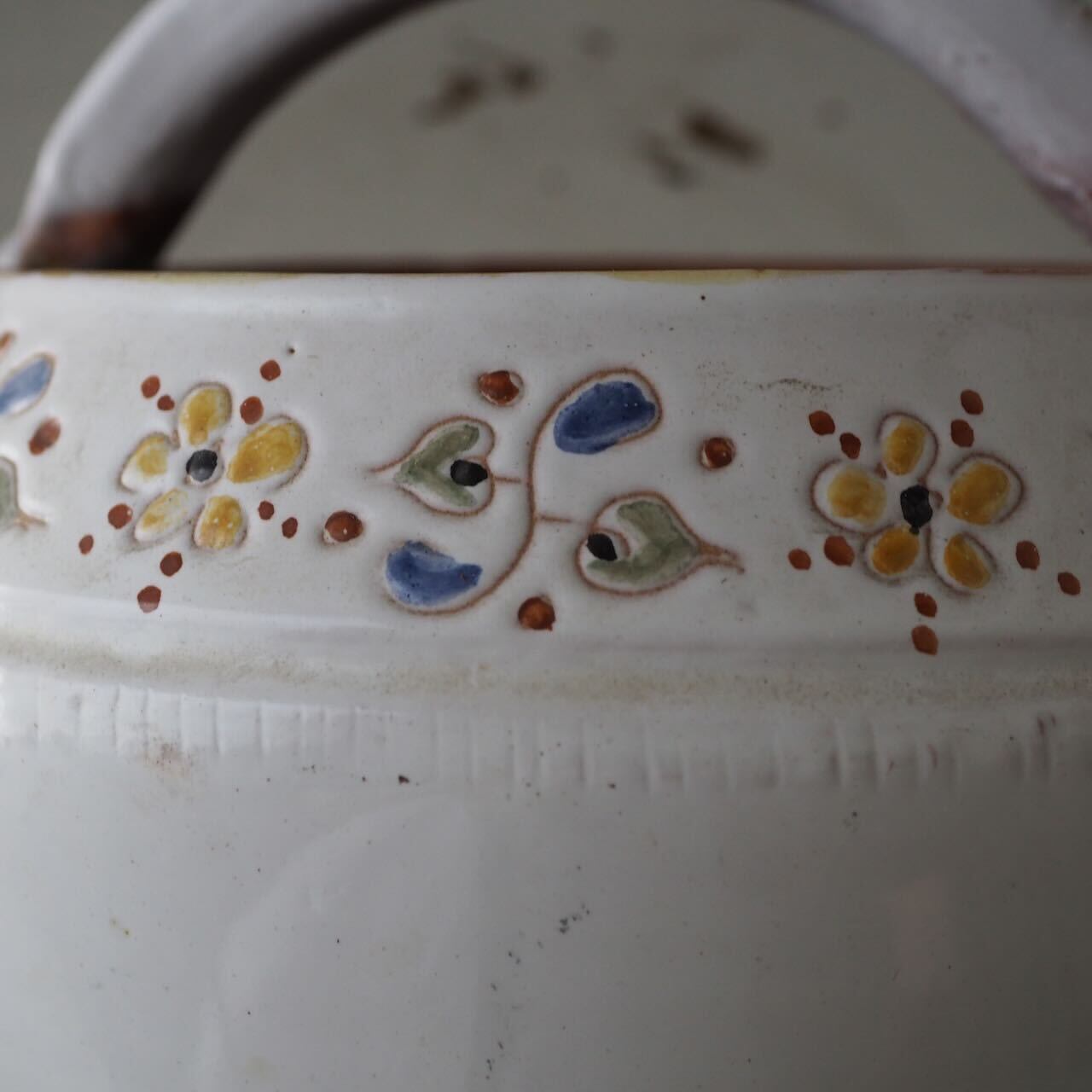 リルシュルラソルグのアンティーク市で見つけた、田舎風白釉のポットです。ムスティエの白に近い、濁りのないきれいな白が印象的。小花や植物の模様がとっても愛らしくて、ぽてっとしたこのポットのフォルムによく似合っています。部屋に置くと、南欧のテラスのような空気感が広がります。