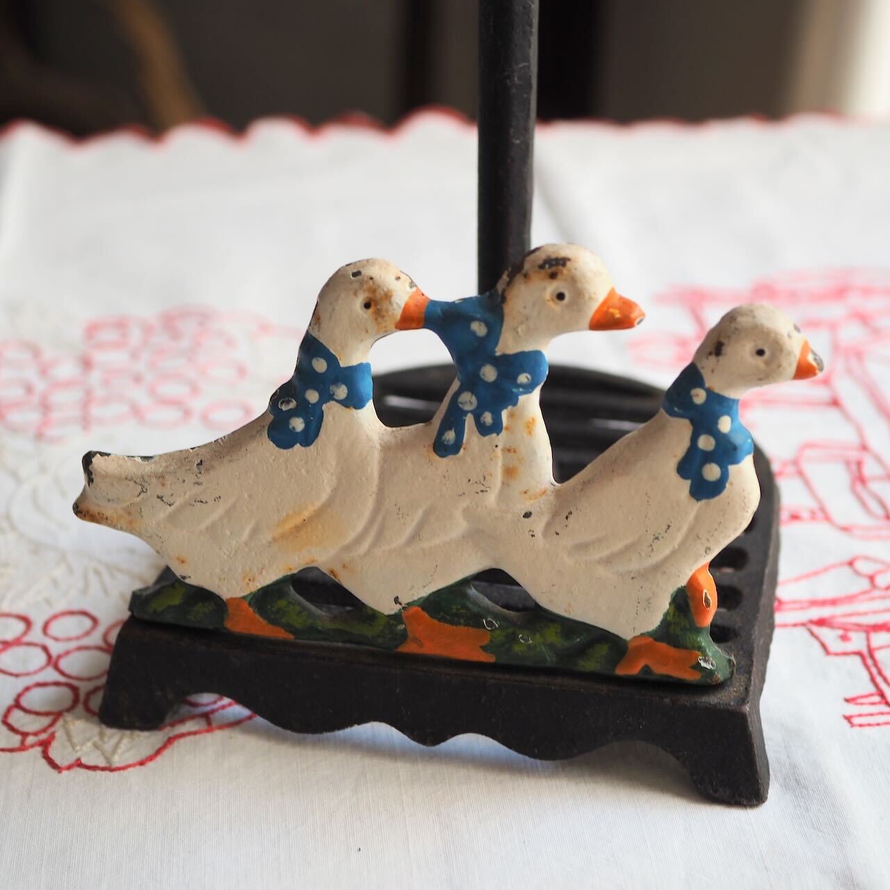 3羽のアヒルが走り回る姿が愛くるしい、ビンテージのキッチンペーパーホルダーです。鉄製でどっしりしています。アヒルたちは一部サビも見られますが、それもまた愛おしい……♡