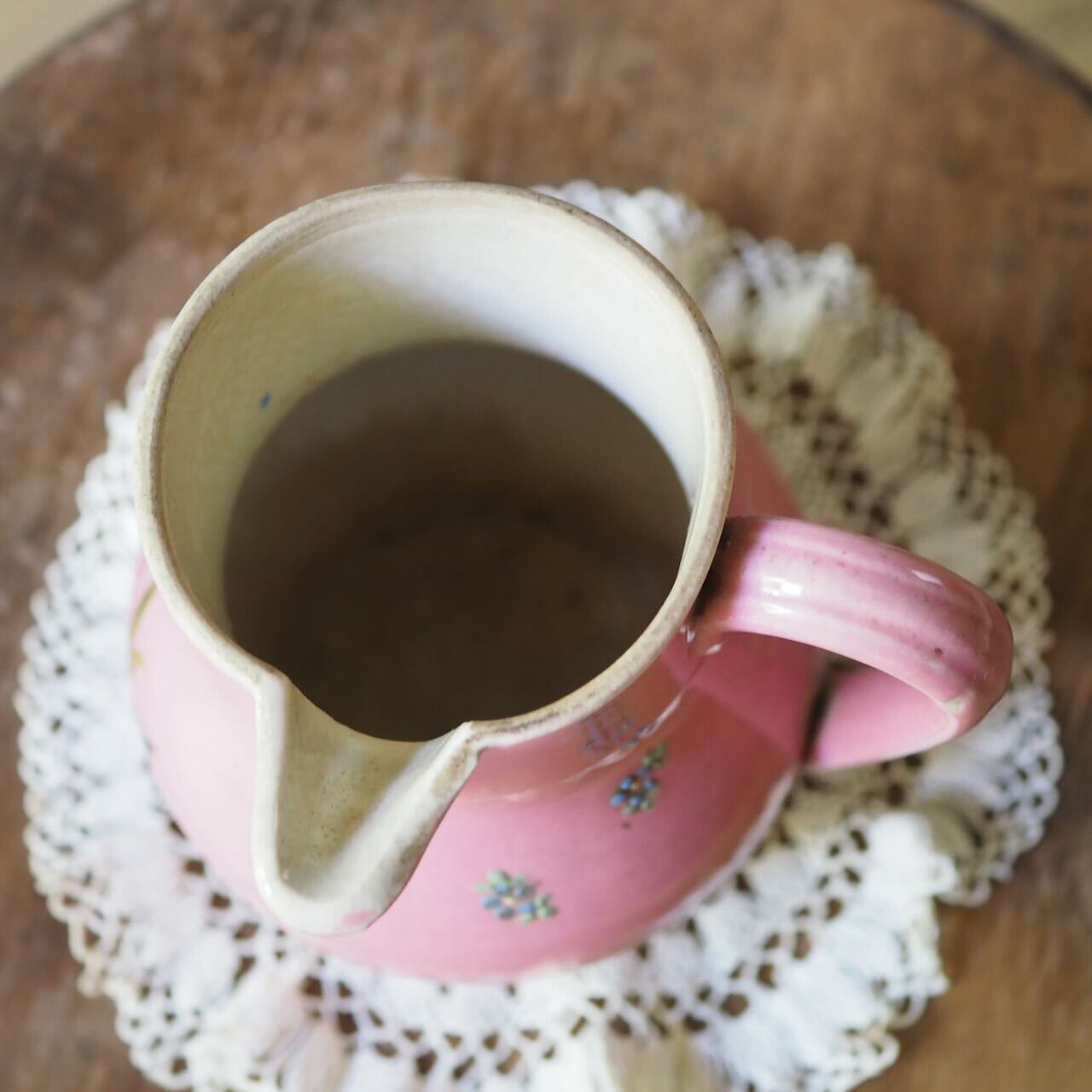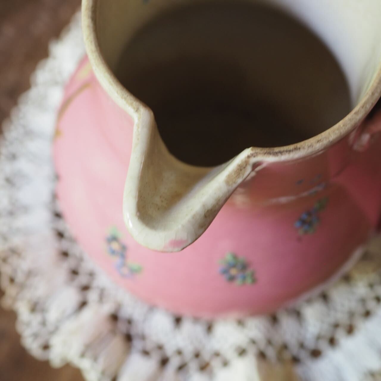 ぽってりした形がかわいらしいアンティークピシェ。時を経たくすんだピンクがなんともいえず愛らしいです。モチーフはわすれなぐさ。それに白い穂の花が添えられています。はっきりとはわかりませんが、1900年前後のものと思われます。
