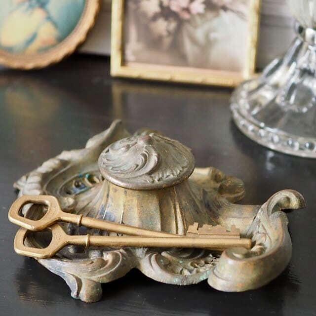 ブロンズ製のアンティークのインク壺。蓋を開けると小さなガラス瓶が入っています。オリジナルの瓶が残っているものはとても希少です。