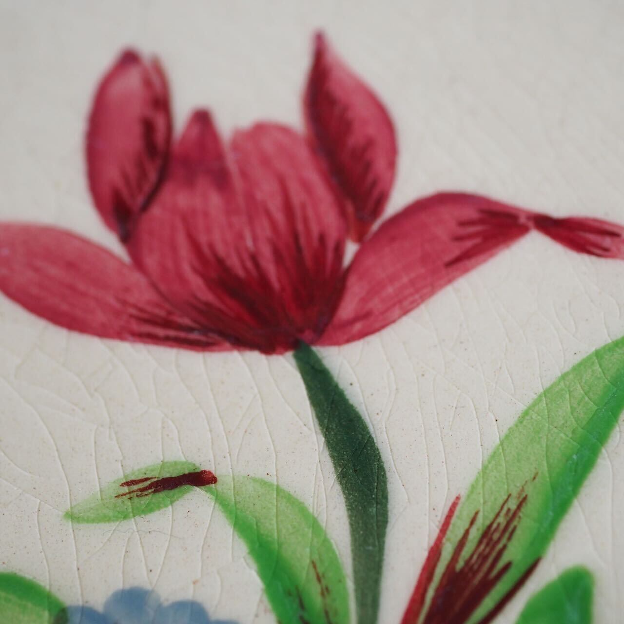 凛としたチューリップとブルーの濃淡の小花が最高に愛らしい、ペクソンヌ窯のケーキ皿です。