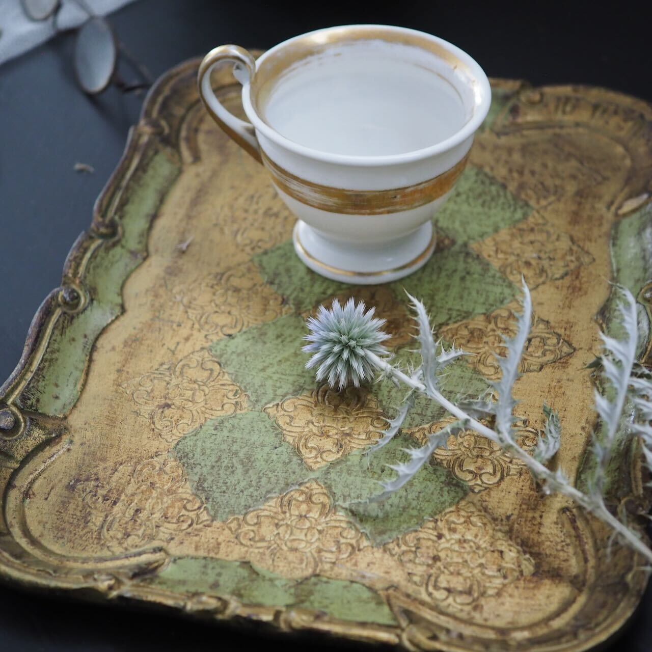 明るいグリーンとゴールドの配色が心地いい、イタリアのアンティークトレイです。木製。こちらは長方形なので、立てかけやすいのも◎。美しいアンティークトレイはアート。いくつか大小並べるととても素敵です。