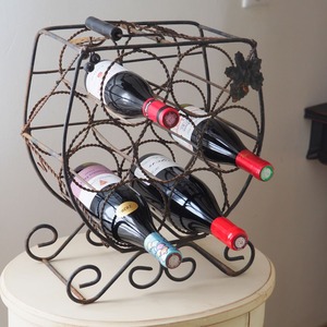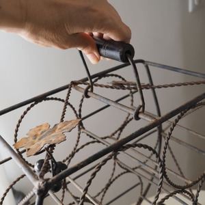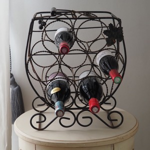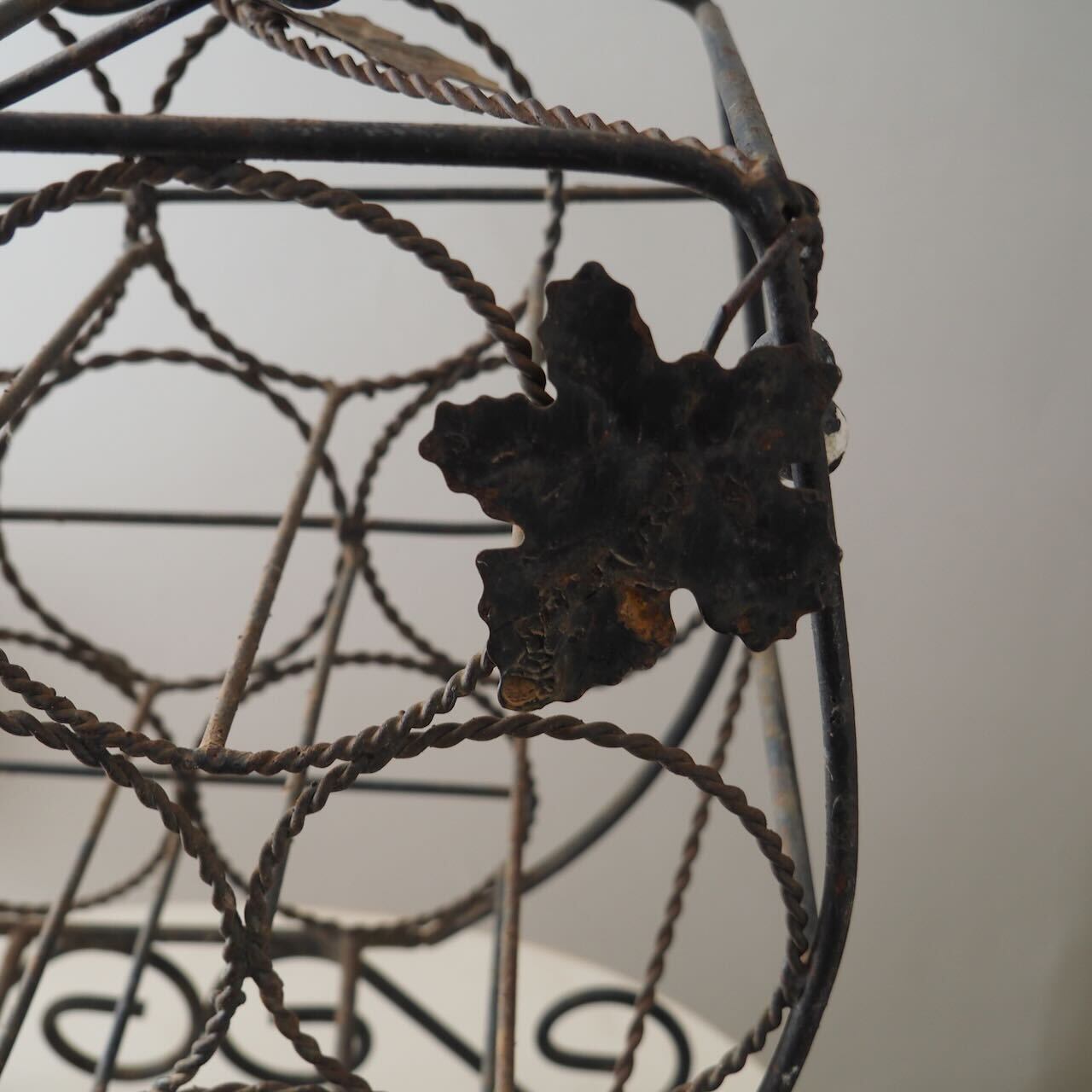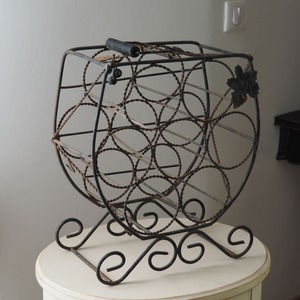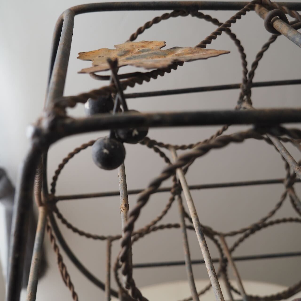 ワインなどが7本入るアンティークのアイアンラックです。ブドウの葉が飾りについていて、持ち手もあったりと細やかな作り手のセンスが感じられる一品です。