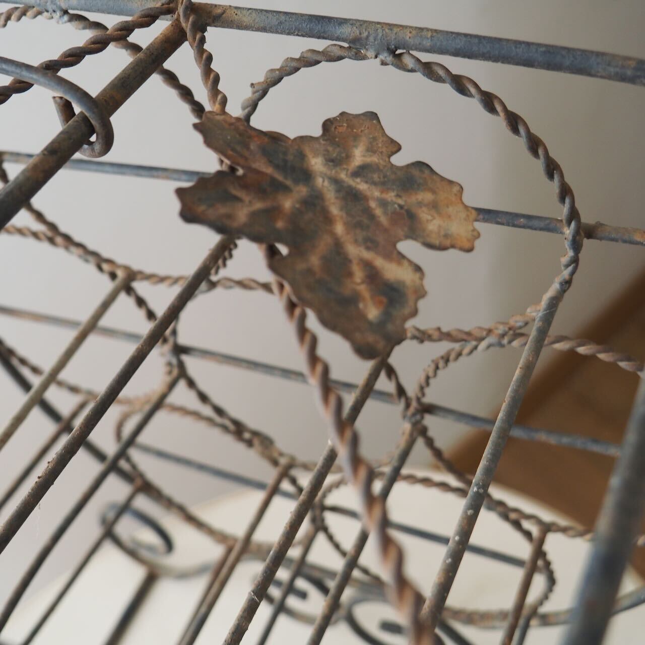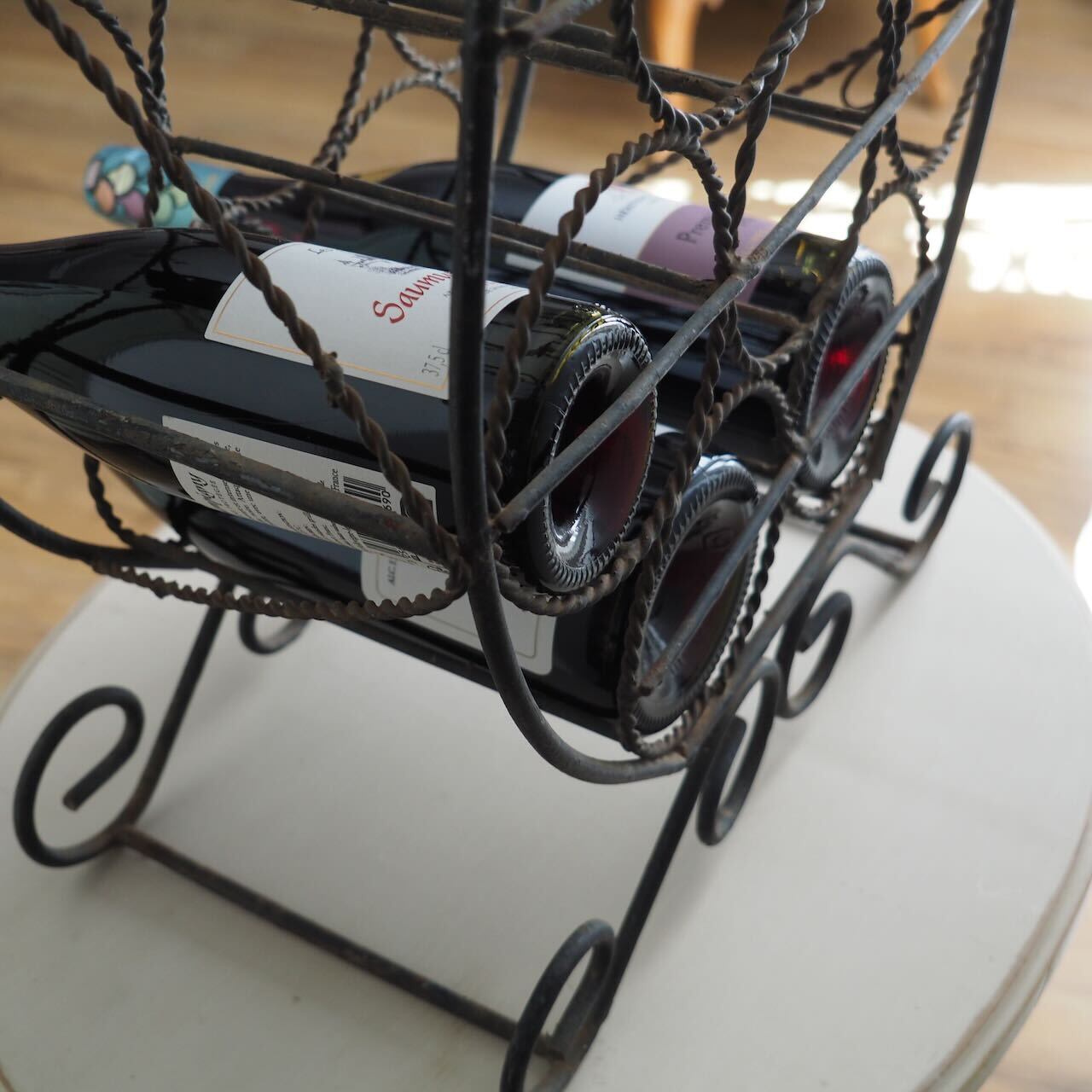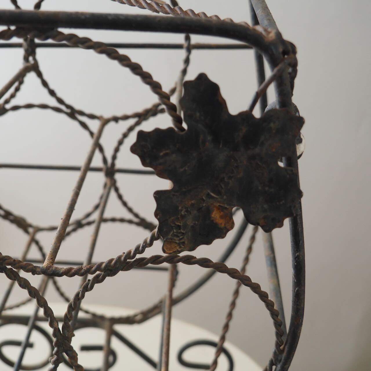 ワインなどが7本入るアンティークのアイアンラックです。ブドウの葉が飾りについていて、持ち手もあったりと細やかな作り手のセンスが感じられる一品です。