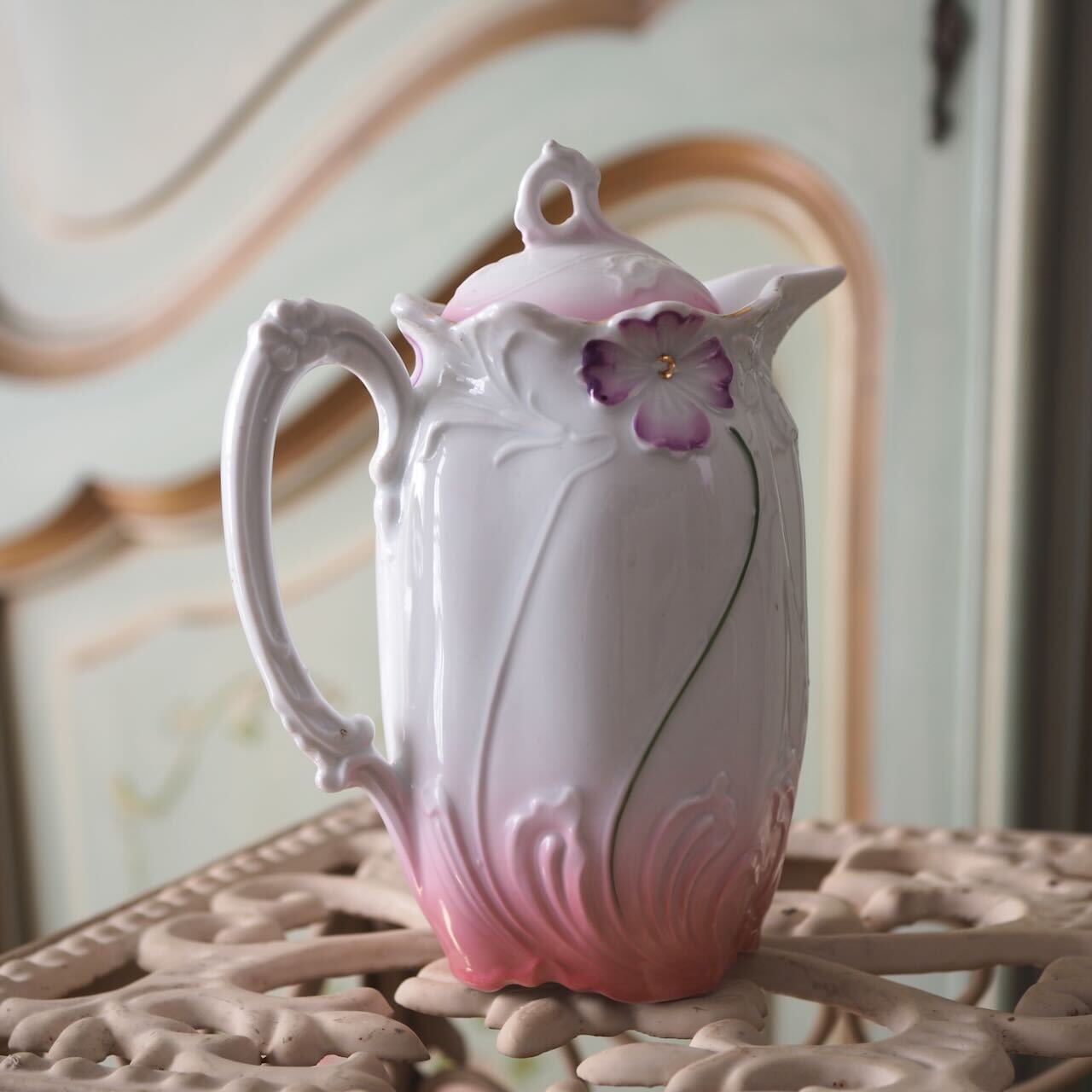 フランス南西部のブロカント市で出会ったピシェです。ピンクのグラデーションが愛らしく、2輪の花のデザインがアール・デコでとてもおしゃれ。後ろ姿は1輪がレリーフだけ、というのも素敵です。