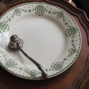 クレイユ・エ・モントローの中でも特別なラブラドールシリーズのスタンプが入った美しいプレートです。こちらは、深みのあるグリーンの濃淡のガーランドがお皿を取り囲んだ「ブリュッセル」シリーズ。中に料理が入るととても映えるお皿です。クレイユ・エ・モントローの品格ここにあり、といった風情。フランスのアンティークプレートの魅力が詰まっています。