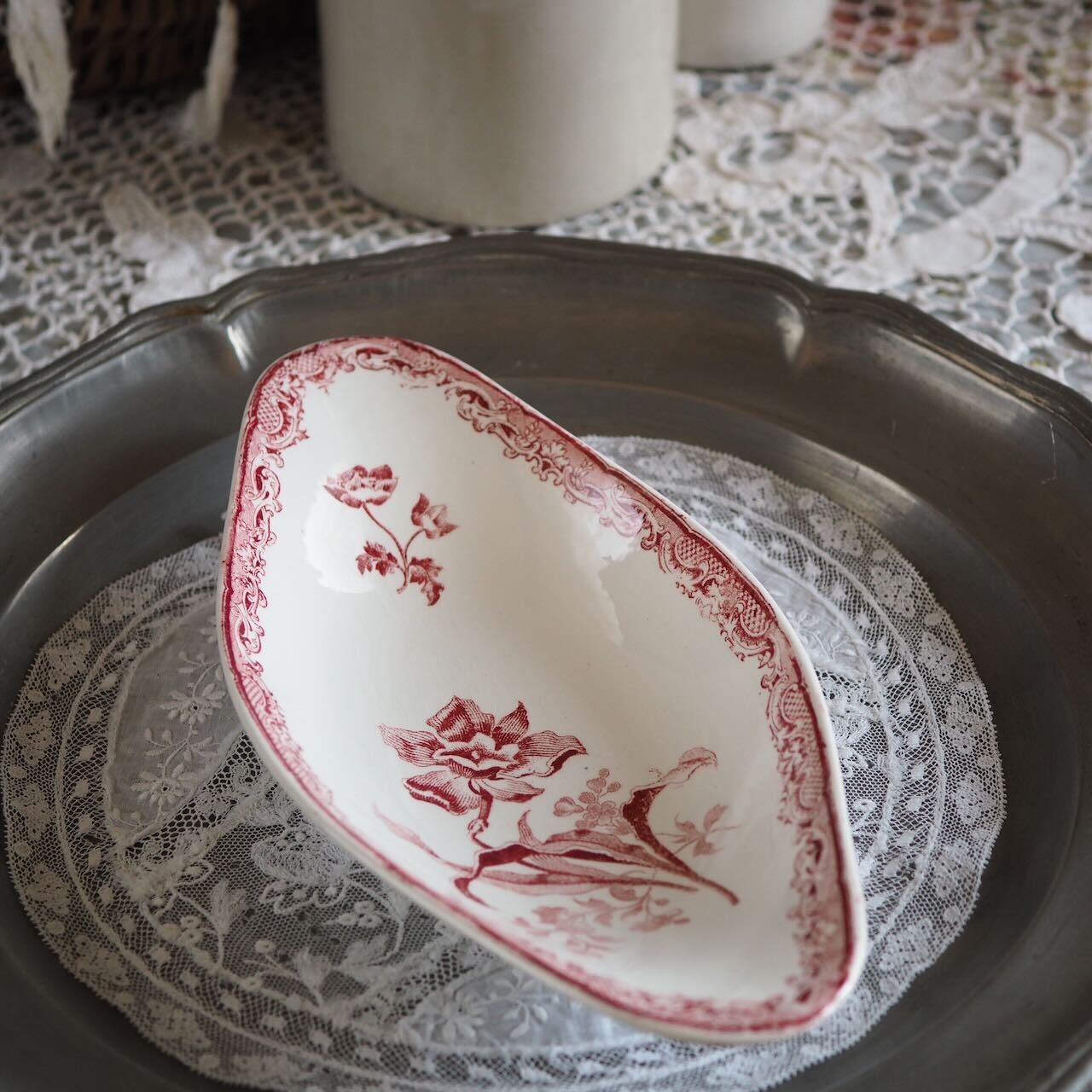 こちらのラヴィエ(前菜皿)は、お食事にもお菓子にもお使いいただける細長いお皿です。縁のガーランドの文様もエレガント......。