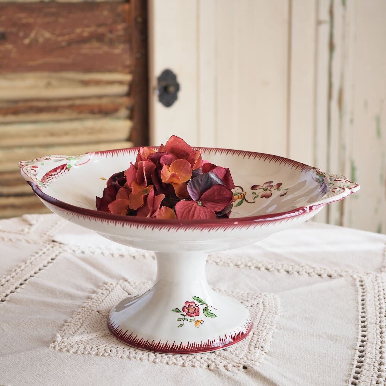 サルグミンヌU&C時代の古いアンティークコンポティエ「ストラスブール」です 。1900年頃のせもの。花が踊るような、軽やかな絵柄。カラフルなお花のシリーズですが、縁取りのボルドー色がシックで大人な雰囲気を醸しています。