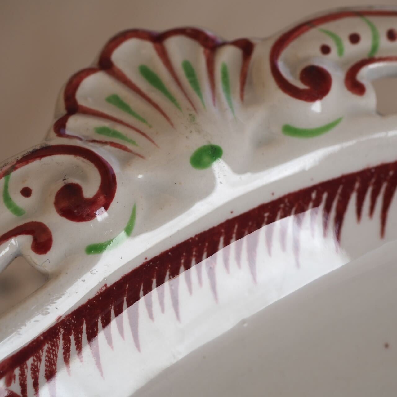 1箇所チップがありますのでお安くなっています(クローズアップ写真をご確認ください)。でも実際お使いになる時には、たぶんほとんど気にならないと思います。この時代のアンティーク品としては奇跡的な状態といえますが、経年による小さな傷や絵柄の掠れ、汚れなどは多少はございます。アンティークにご理解の上お求めください。